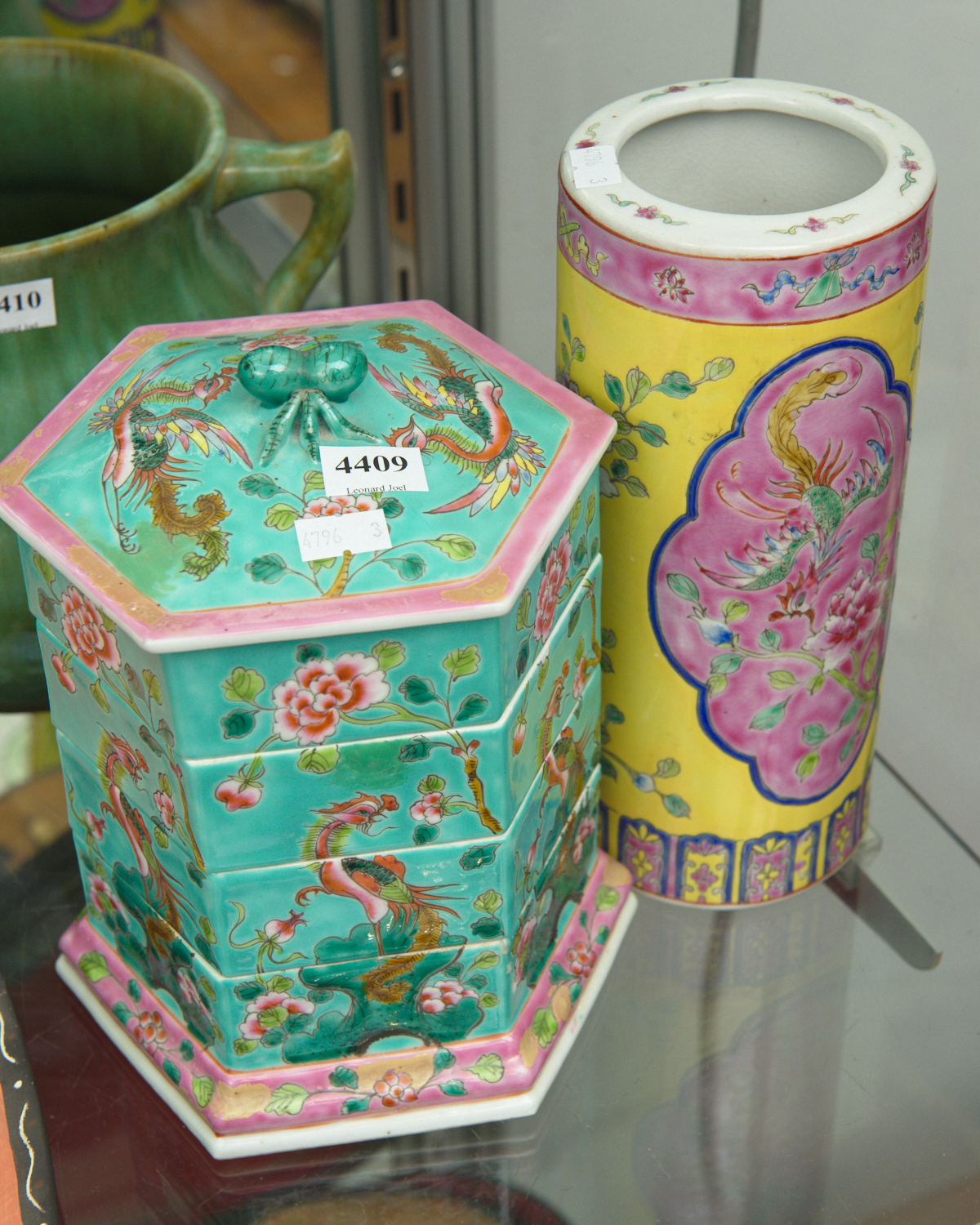 AN ENAMELLED PORCELAIN FOUR SECTIONAL CONTAINER AND A CYLINDRICAL VASE