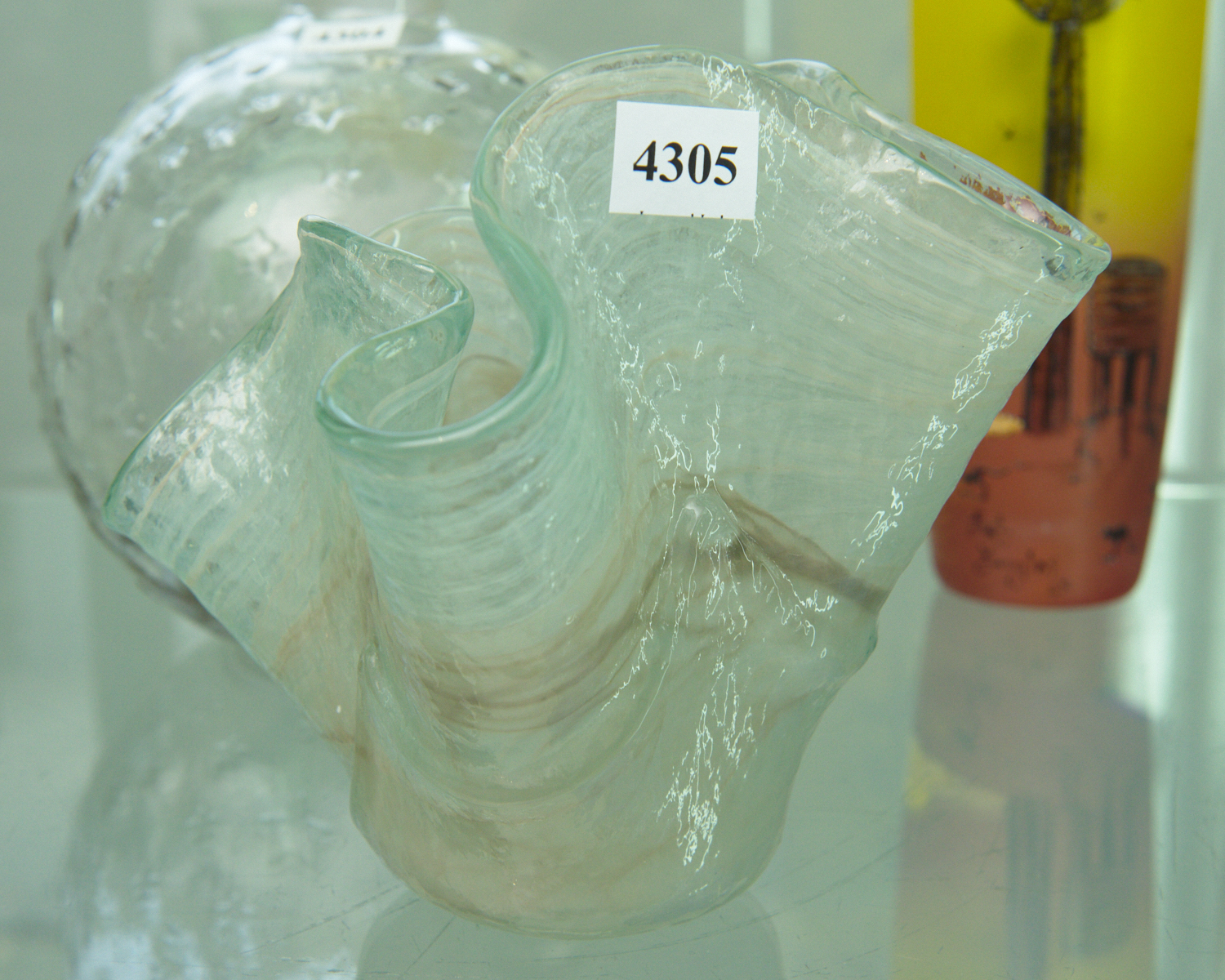 A MOTTLED WHITE GLASS HANDKERCHIEF VASE