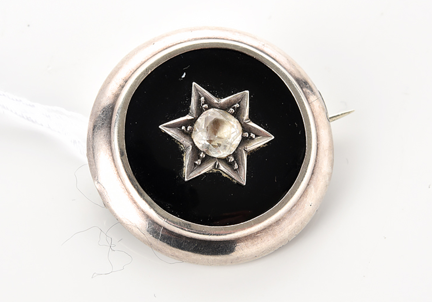 A VICTORIAN ONYX AND PASTE SET MORNING BROOCH IN SILVER, GLASS A/F, DIAMETER 30MM