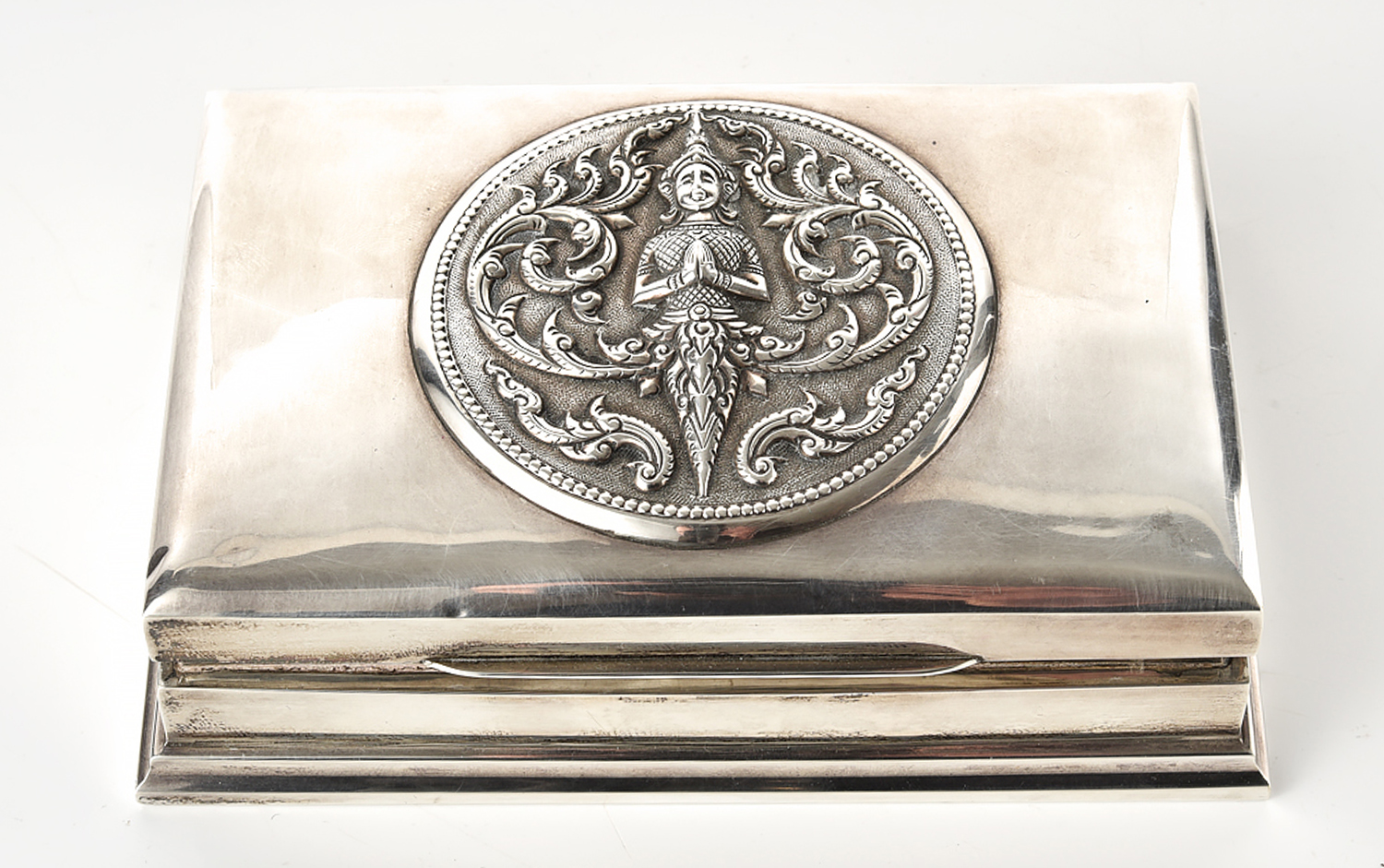 A JEWELLERY BOX, THE OUTSIDE IN STERLING SILVER FROM SIAM, 14.5x9.7CM (MINOR DENTS AND WEAR)