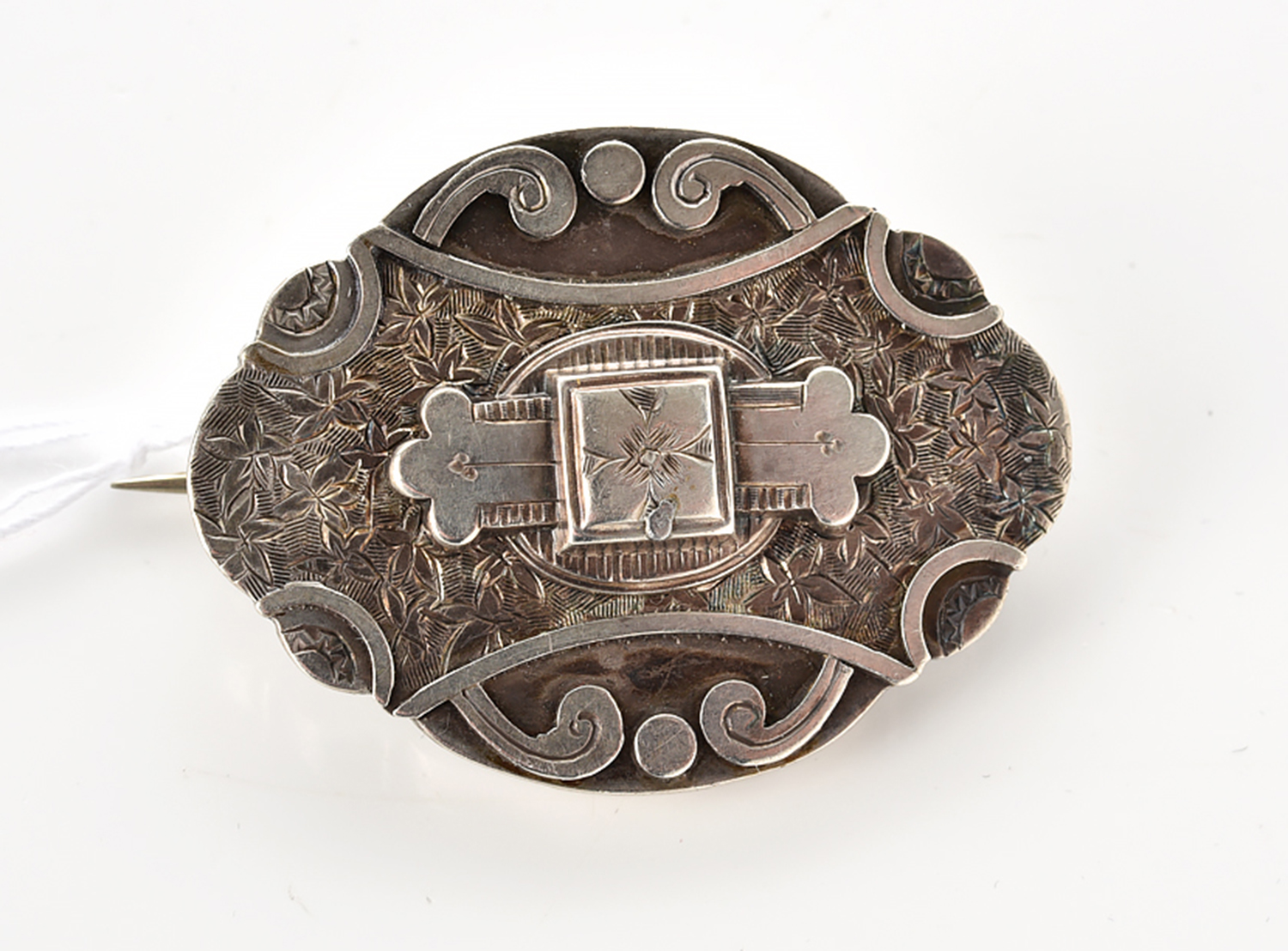AN ANTIQUE BROOCH WITH FINE ENGRAVINGS IN SILVER (NO GLAZING TO REVERSE), 40x30mm