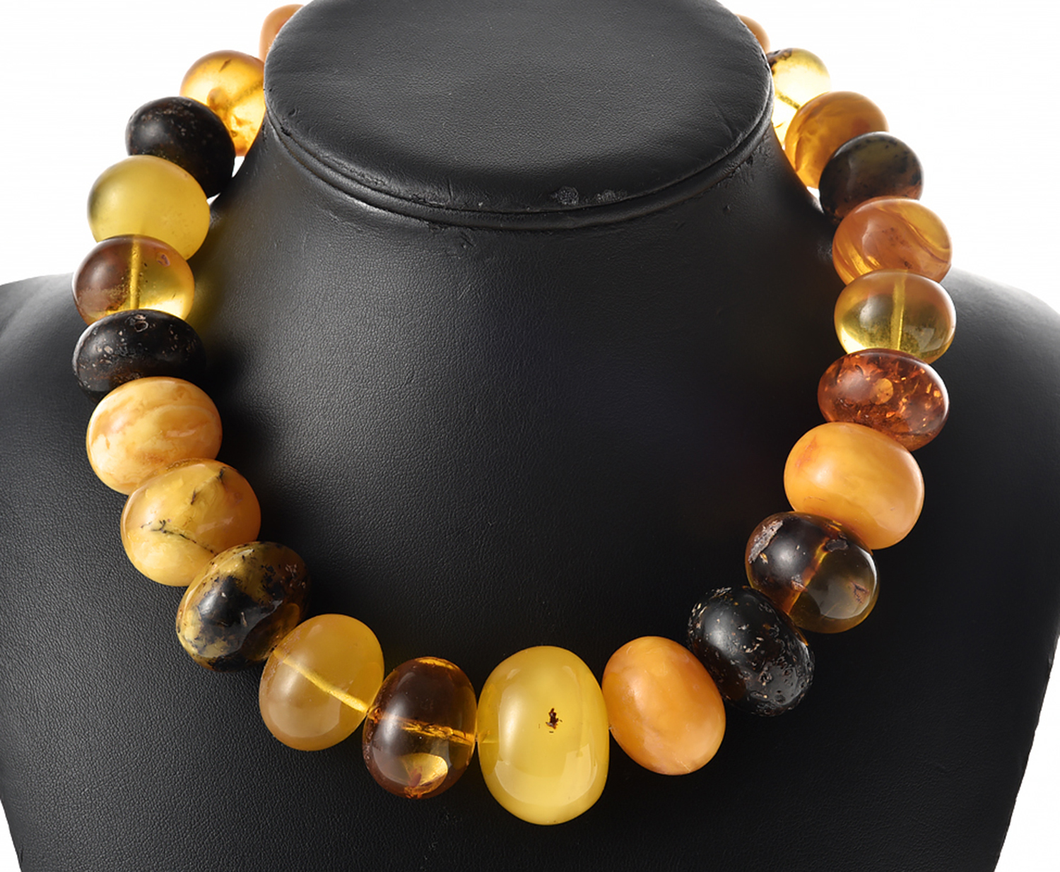 A STRAND OF MULTICOLOURED LARGE AMBER BEADS TO A STERLING SILVER T-BAR CLASP, HALLMARKED LONDON 1903, LENGTH 48CM