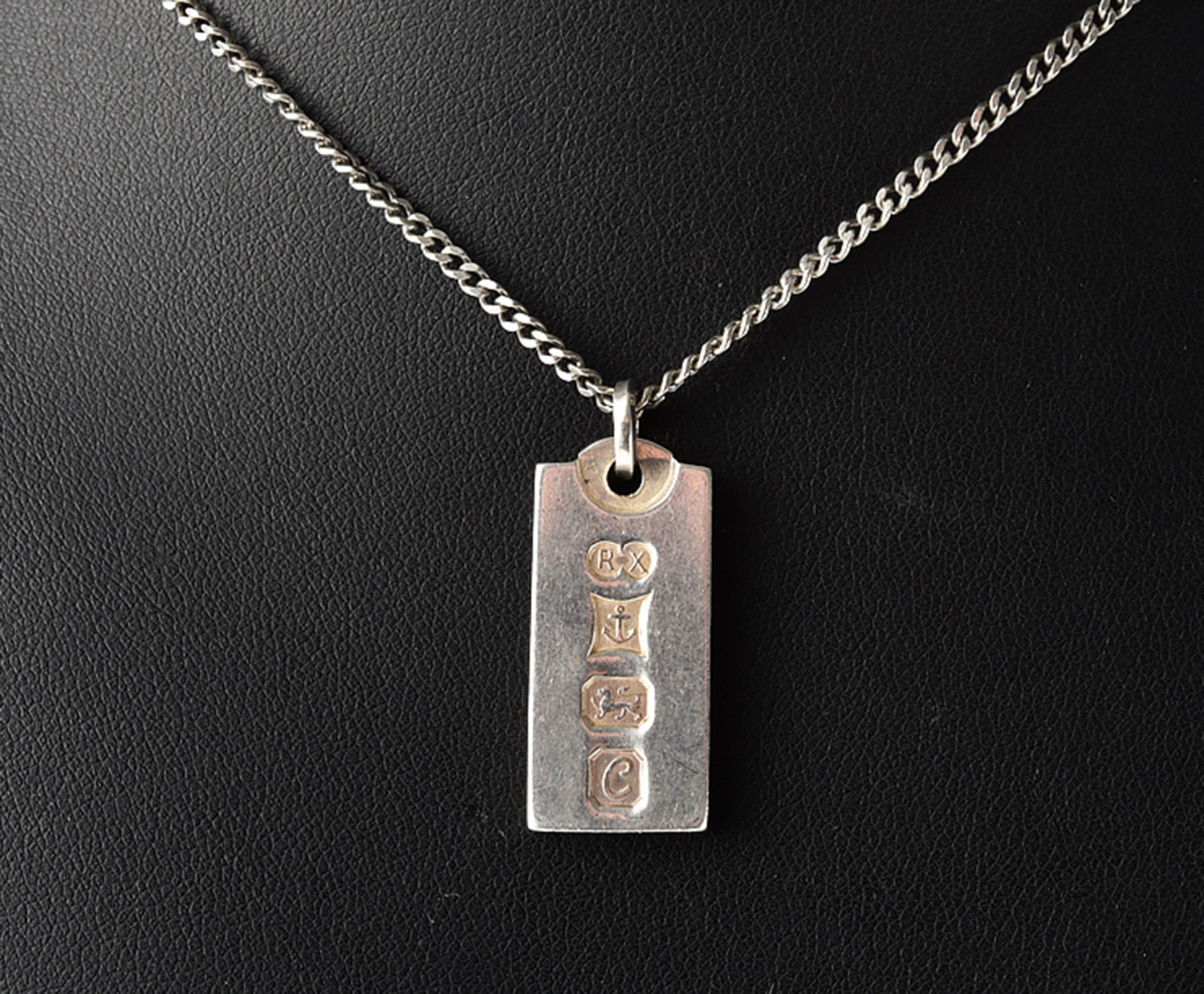 A STERLING SILVER INGOT PENDANT, HALLMARKED BIRMINGHAM, 1977, MAKER R.X, WITH CHAIN IN STERLING SILVER, TOTAL WEIGHT 14.7GMS, PENDANT MEASURING 2.5x1.1CM