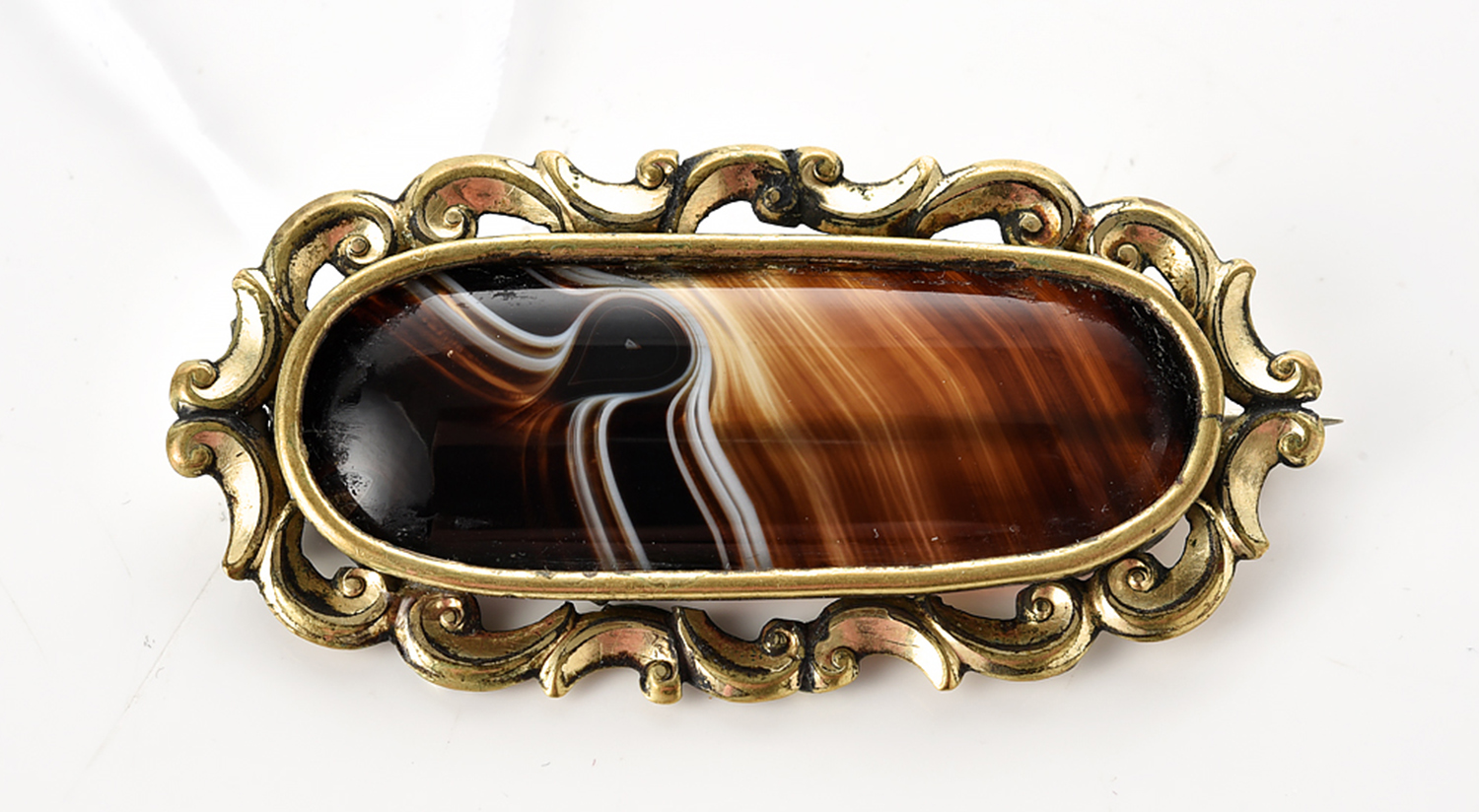 AN ANTIQUE AGATE BROOCH TO A PINCHBECK FRAME, 55x26MM
