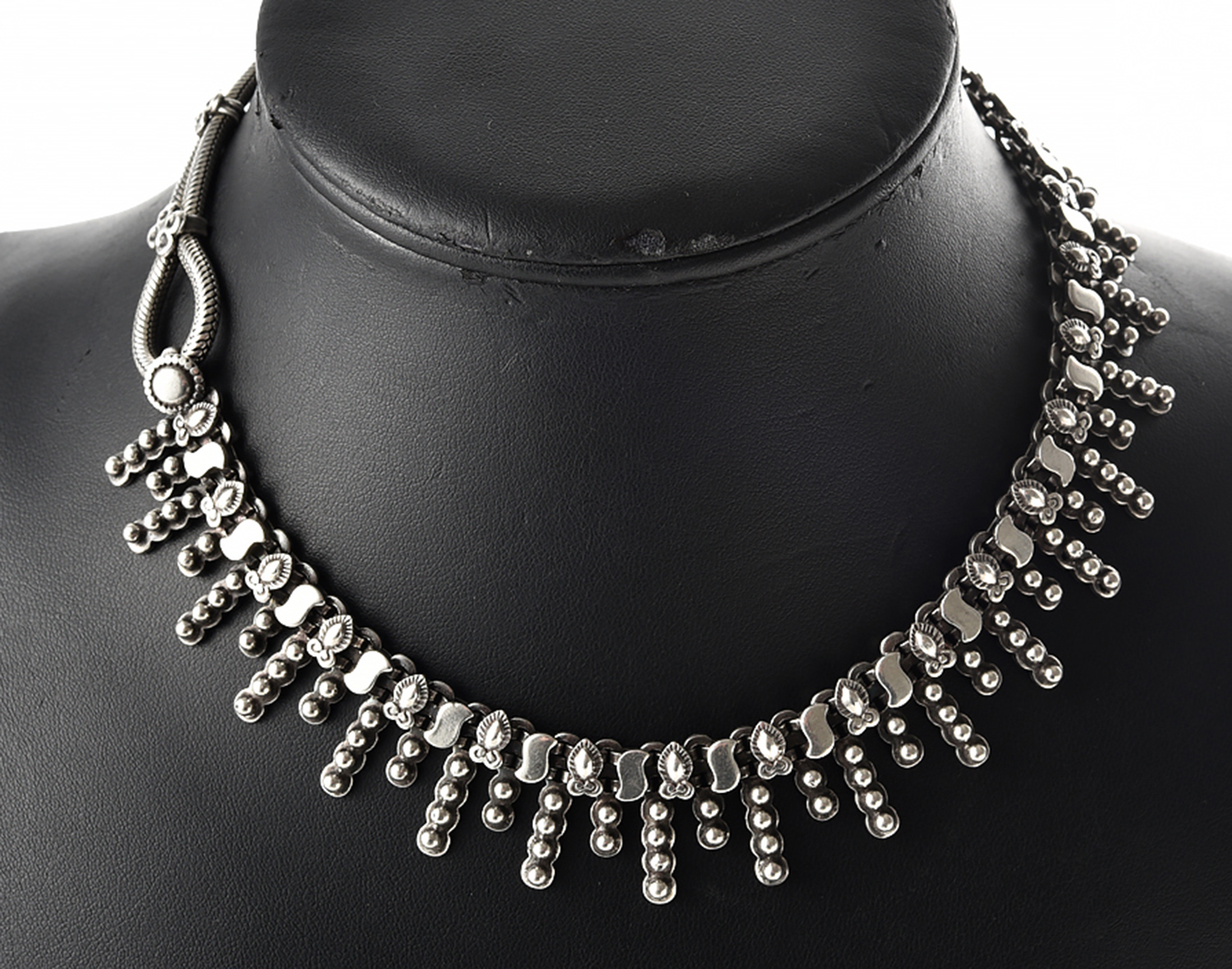 AN ANTIQUE INDIAN RAJASTHANI COLLAR NECKLACE IN SILVER, TOTAL LENGTH 36CM