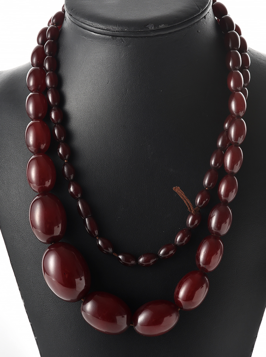 A LONG STRAND OF GRADUATED CHERRY AMBER STYLE RESIN BEADS