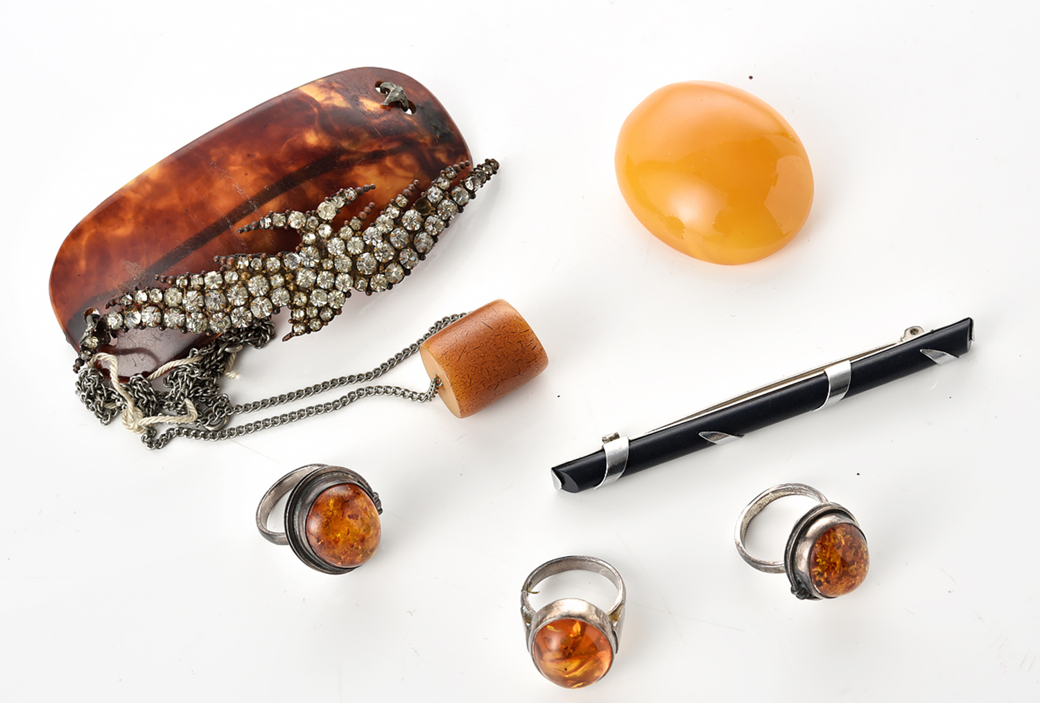 A COLLECTION OF AMBER JEWELLERY COMPRISING THREE RINGS, A BROOCH, A NECKLACE, TOGETHER WITH A RHINESTONE HAIRCLIP AND A MODERNIST BROOCH