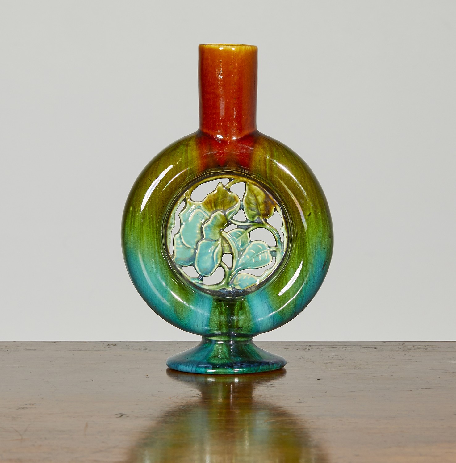 Manufactured by the Linthorpe Pottery, circa 1890, brown and green glazed with a pierced panel of a rose, impressed marks.