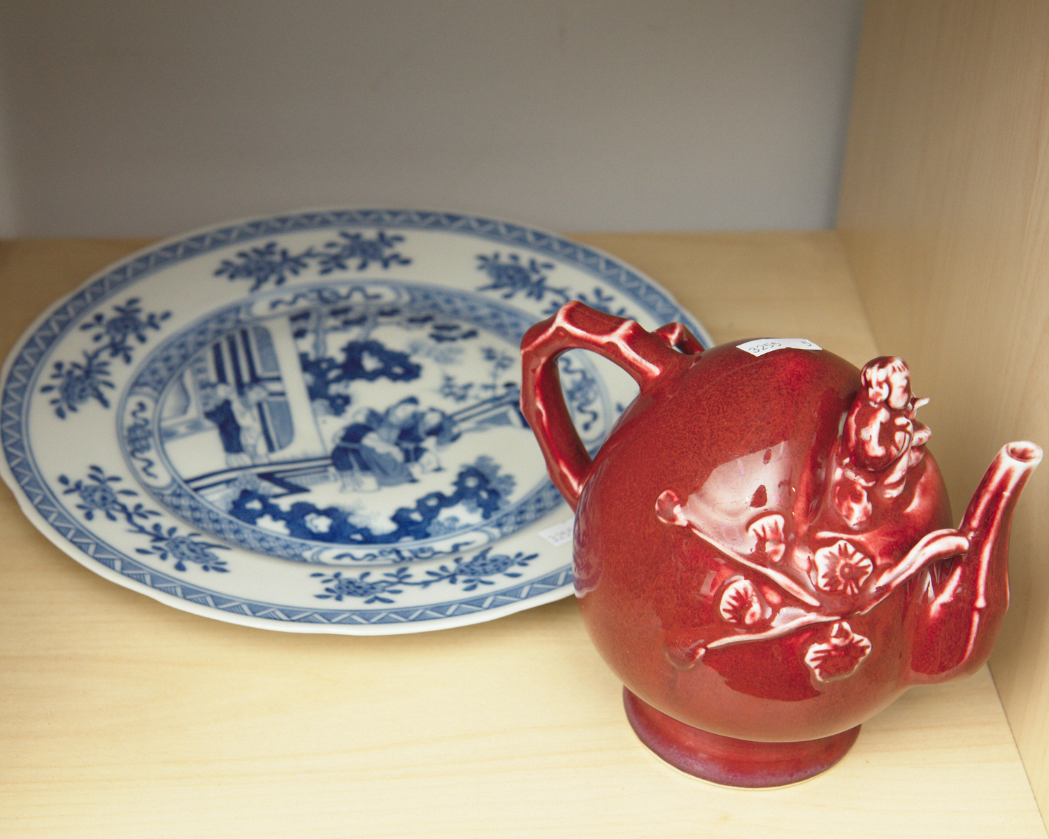 A CHINESE BLUE AND WHITE PLATE TOGETHER WITH RED GLAZE TEAPOT