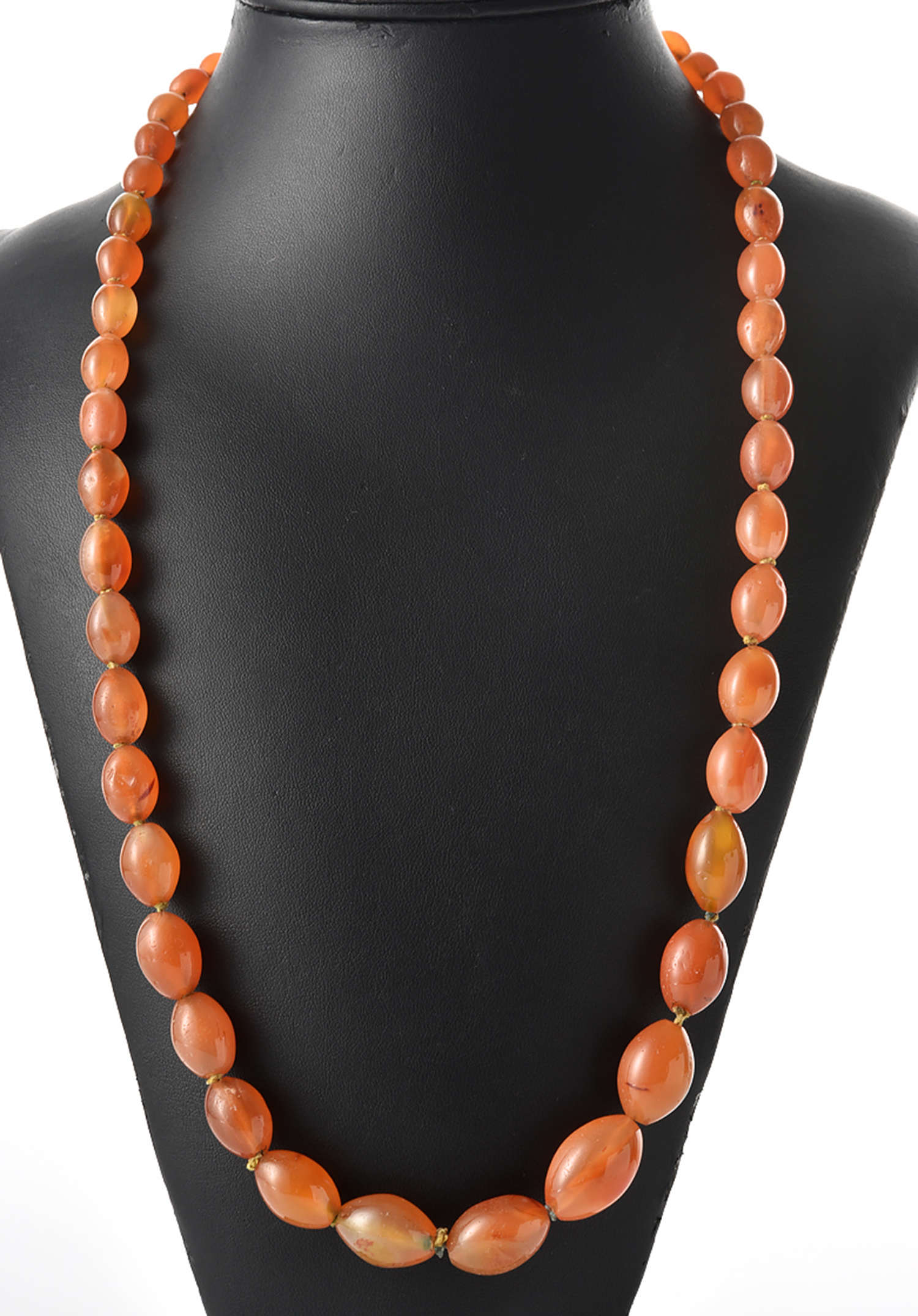 A VINTAGE STRAND OF GRADUATED CARNELIAN BEADS TO A SCREW CLASP, TOTAL LENGTH 740MM