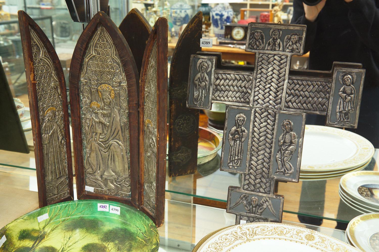 A THREE SECTIONAL WOOD BACKED LEATHER MOUNTED EMBOSSED RELIGIOUS TRIPTYCH, TOGETHER WITH ONE OTHER WOOD BACKED EMBOSSED METAL MOUNTED RELIGIOUS PLAQUE OF SECTIONAL COMPOSITION