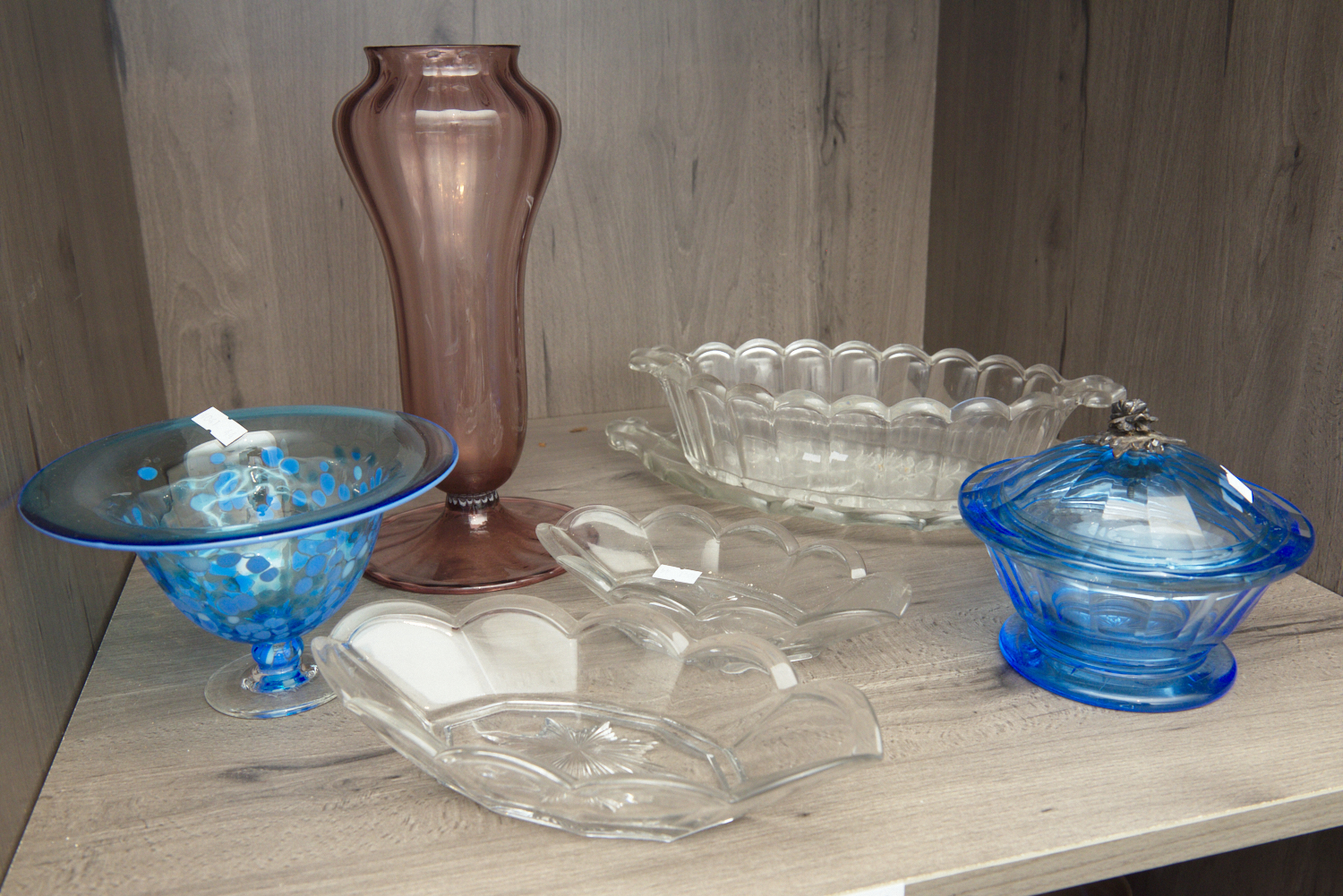 A COLLECTION OF GLASS INCLUDING CLEAR, AMBER AND BLUE GLASS LIDDED BOWL (DAMAGED) AND VASES