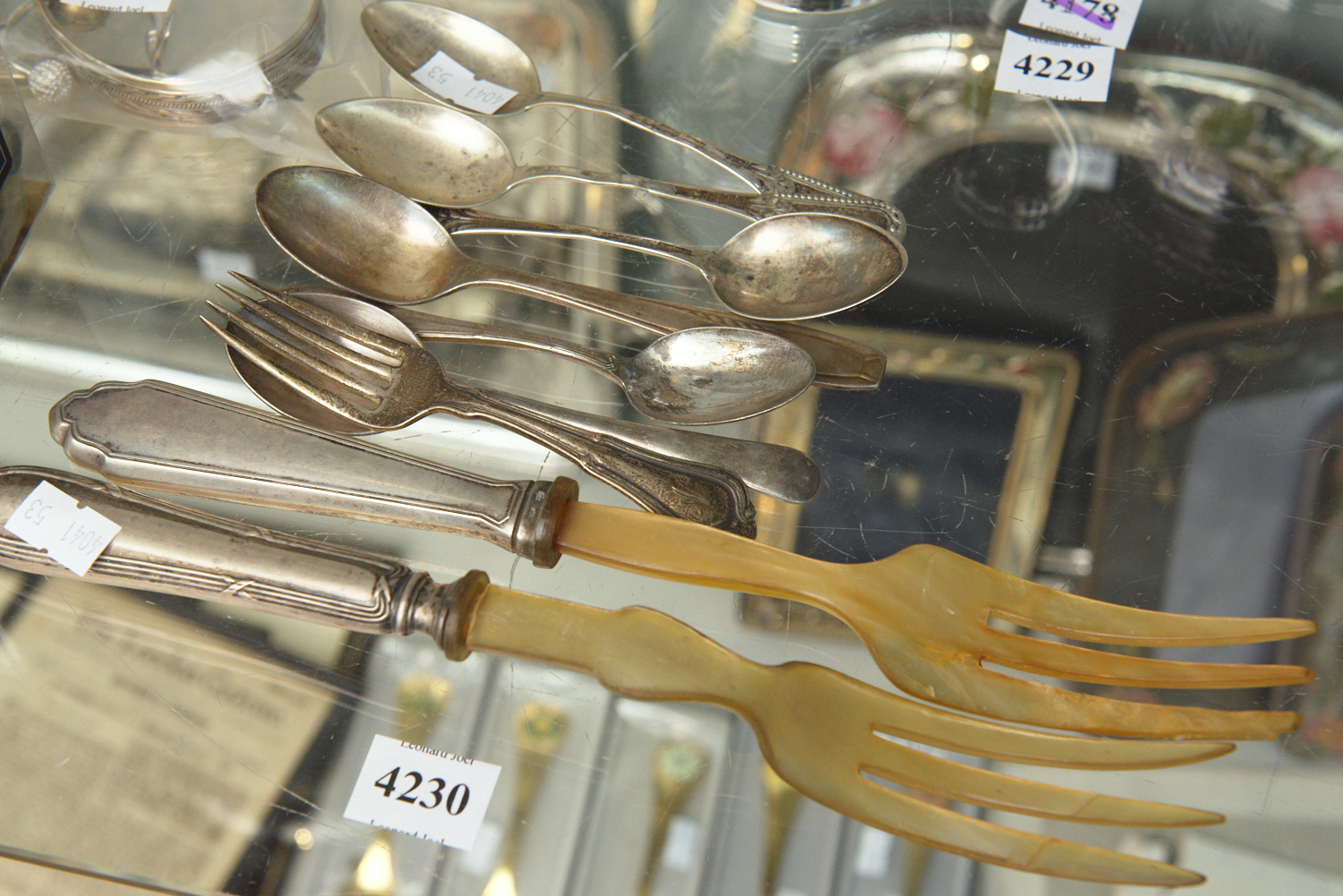 A COLLECTION OF 800 SILVER, STERLING SILVER AND EPNS SPOONS AND A PAIR OF SERVERS WITH 800 SILVER HANDLES