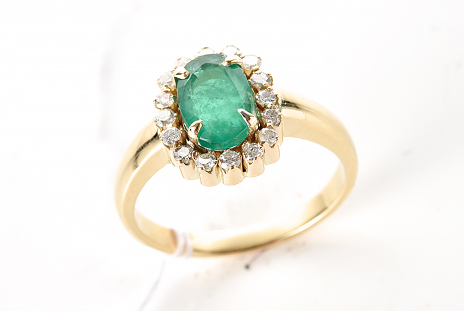 AN EMERALD AND DIAMOND CLUSTER RING IN 18CT GOLD, THE OVAL CUT EMERALD ESTIMATED 2.46CTS, SIZE T, 6.3GMS