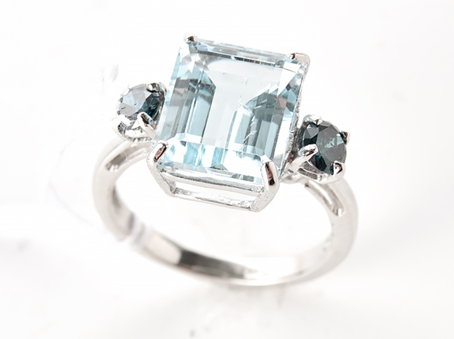 The blue diamonds are treated; one side stone shows visible chips on the table and near facet.