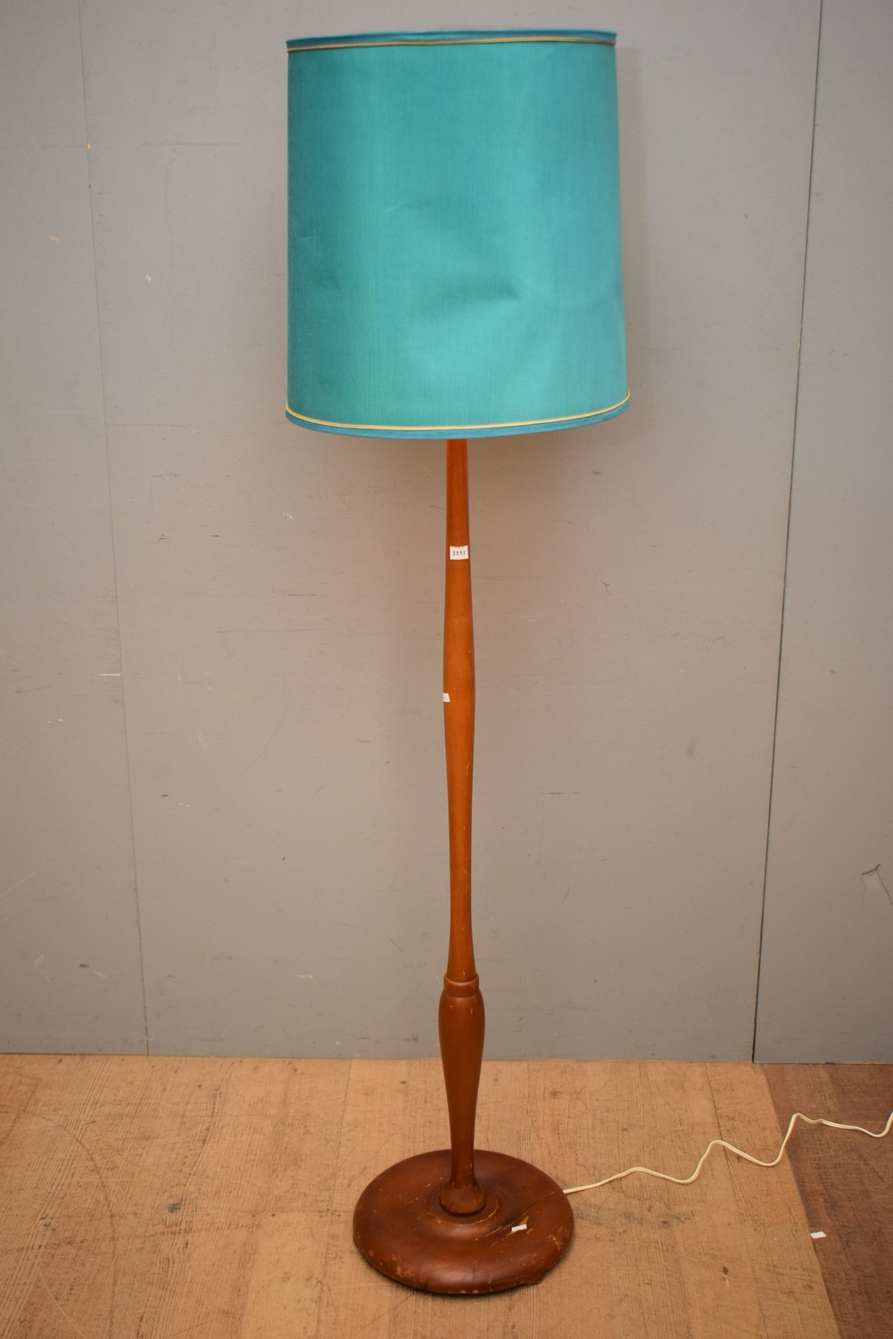 A MID-CENTURY TEAK FLOOR LAMP WITH GREEN SHADE (A/F) (174 CM H)