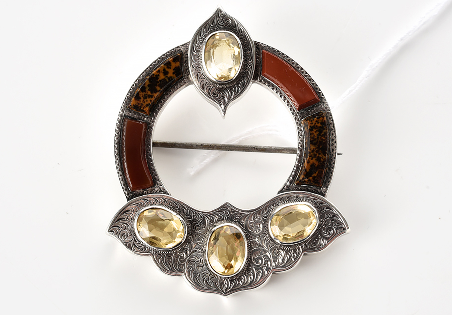 AN ANTIQUE SCOTTISH AGATE AND CAIRNGORM BROOCH/PENDANT IN SILVER, 50x43MM