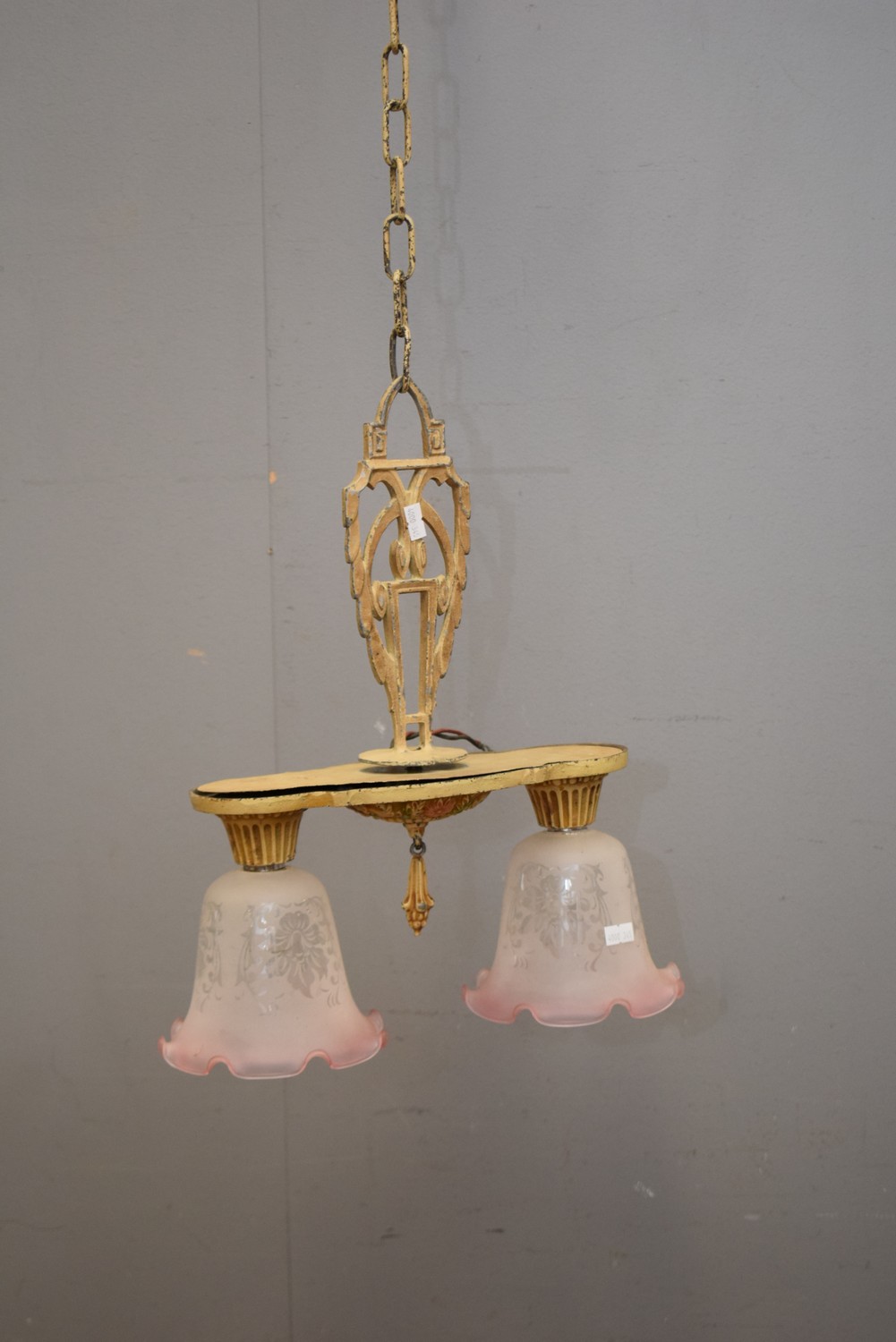 AN ANTIQUE CAST METAL FLORAL TWO SHADE GLASS CEILING LIGHT (80 CM H)