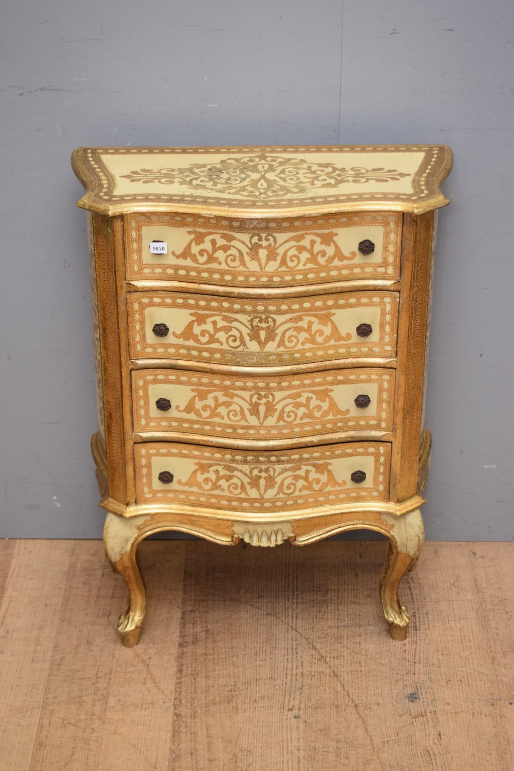 AN EARLY 20TH CENTURY ITALIAN FLORENTINE GILTWOOD FOUR DRAWER CHEST OF DRAWERS (82H X 62W X 29D CM)