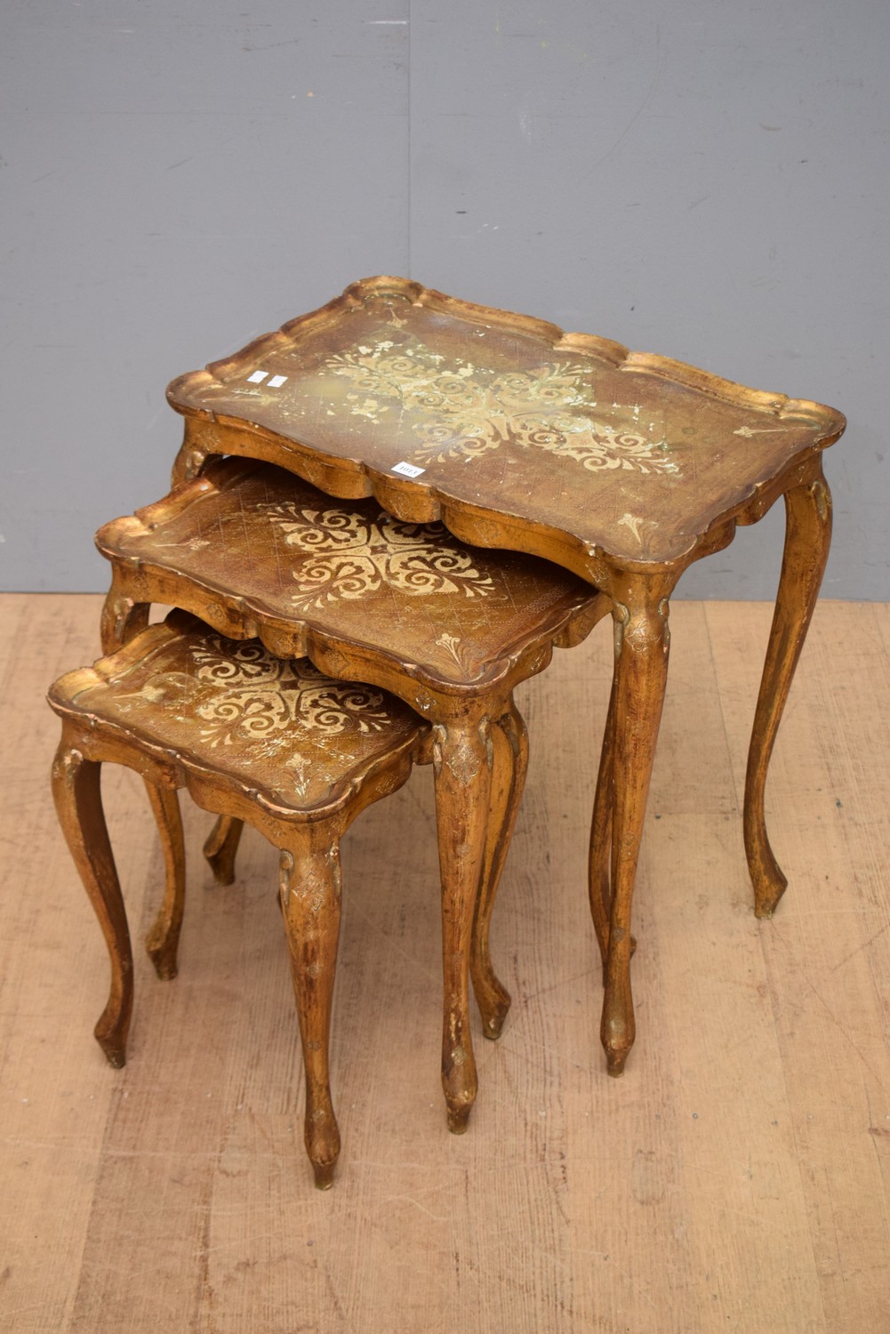 A SET OF THREE 1920S ITALIAN FLORENTINE GILTWOOD STACKING TABLES (LARGEST 58H X 55W X 35D CM)