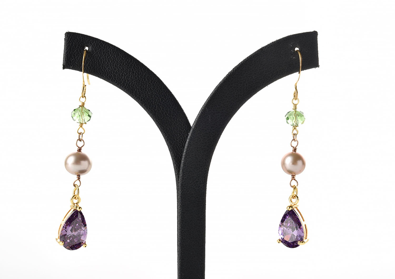 A PAIR OF FRESHWATER PEARL, SYNTHETIC AMETHYST AND PASTE DROP EARRINGS IN SILVER GILT, TO SHEPHERD HOOK FITTINGS, TOTAL LENGTH 60MM