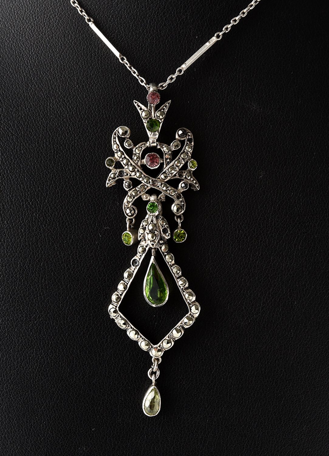 AN EDWARDIAN STYLE PERIDOT AND PASTE PENDANT, TO A BATON LINK CHAIN IN SILVER, LENGTH OF THE PENDANT 70MM, LENGTH OF THE CHAIN 450MM