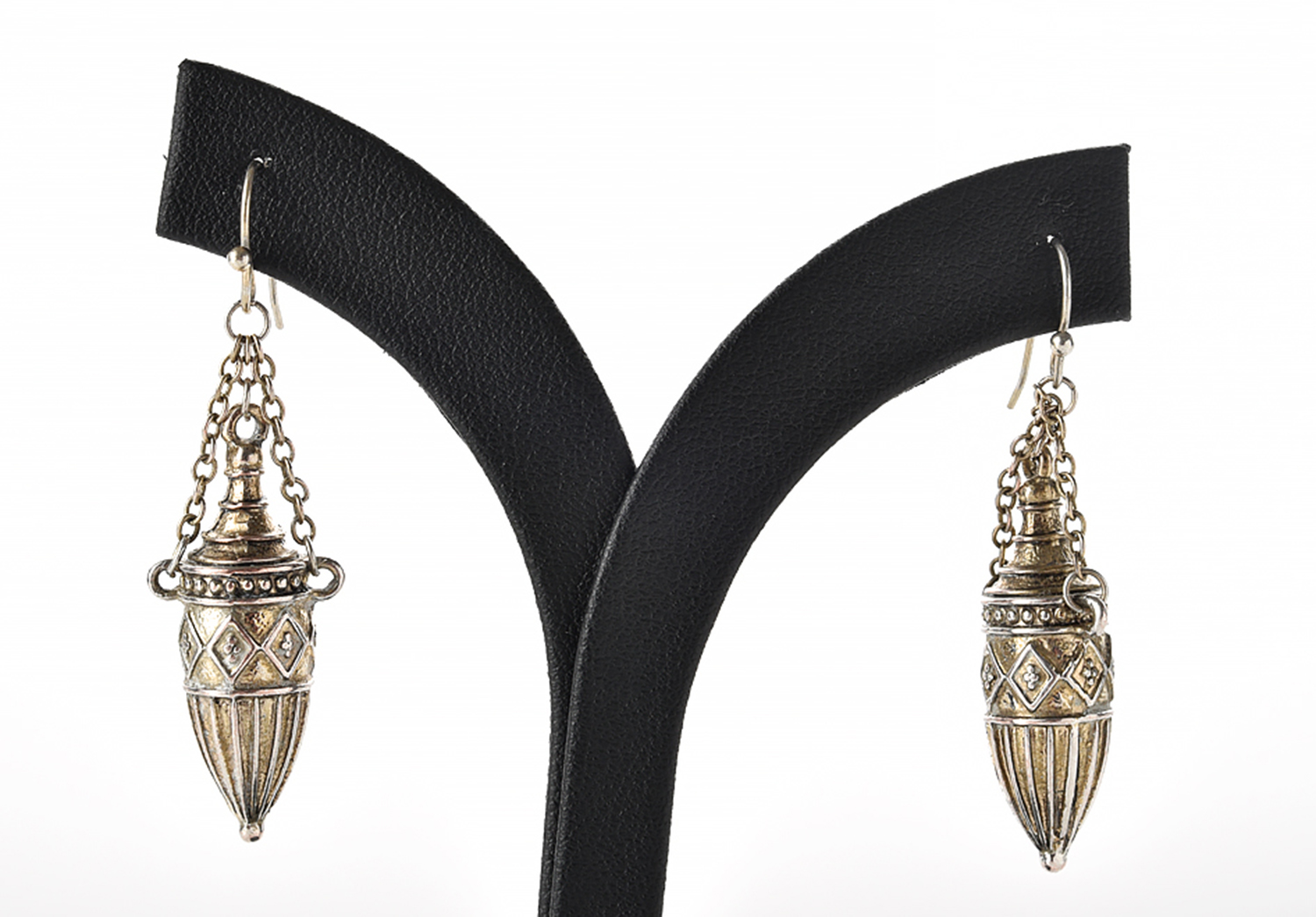 A PAIR OF GREEK REVIVAL AMPHORA STYLE EARRINGS IN CONTINENTAL SILVER, TO SHEPHERD HOOK FITTINGS, LENGTH 50MM