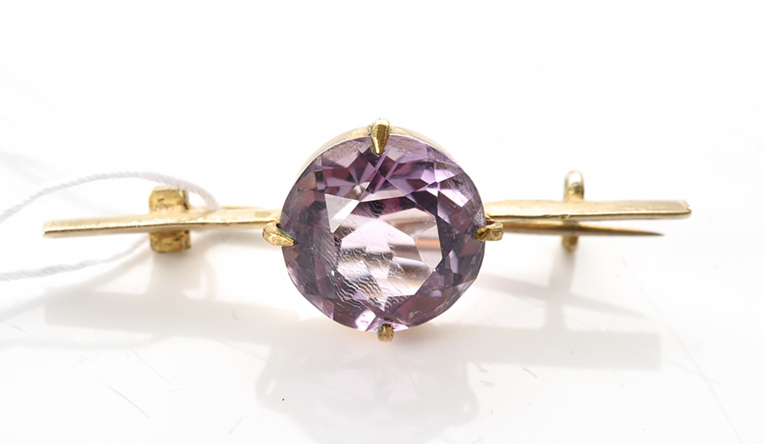 AN AMETHYST SET BAR BROOCH IN 9CT GOLD (THE PIN IN METAL), THE ROUND AMETHYST ESTIMATED 6.15CTS, TOTAL LENGTH 40MM, 3GMS