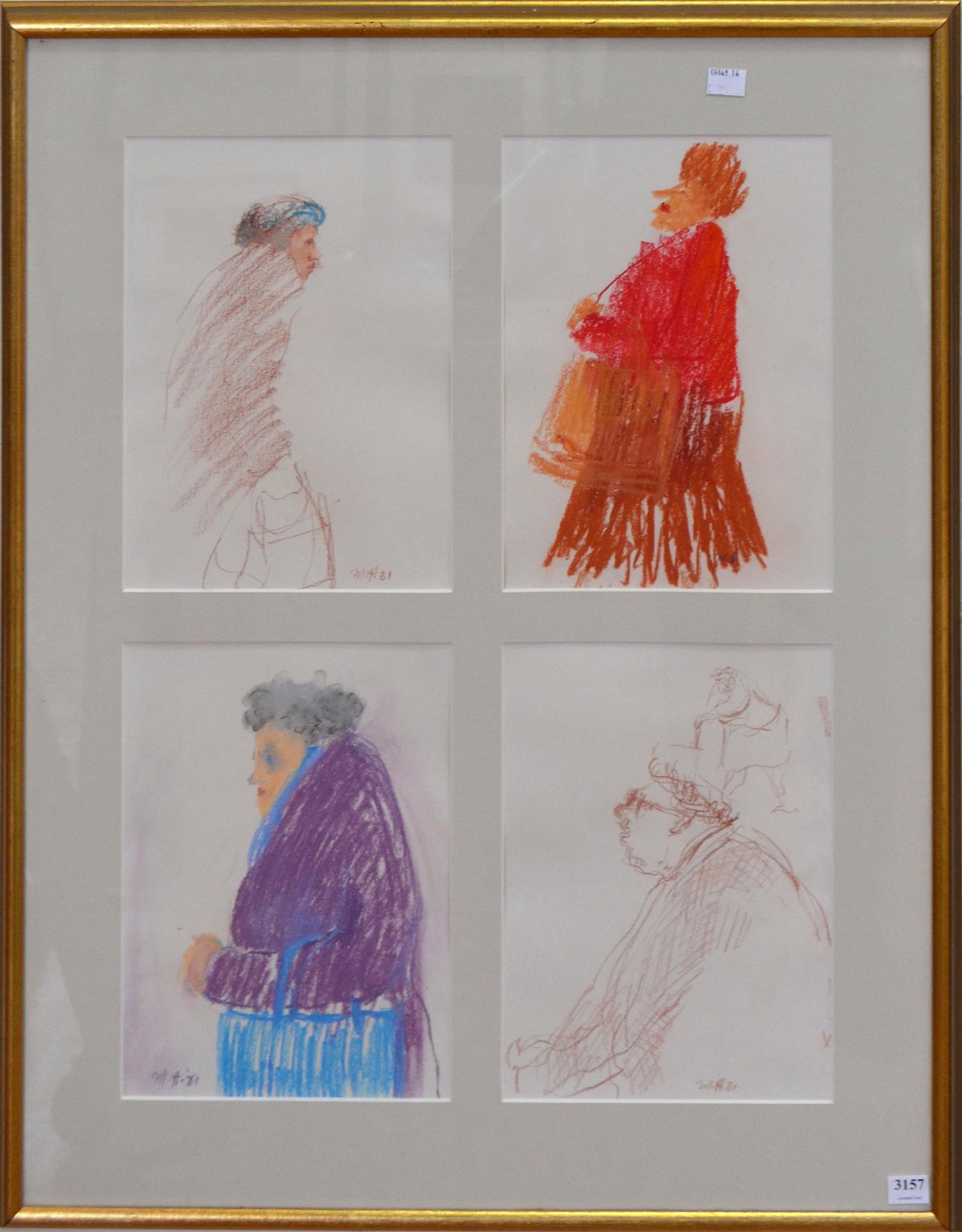 MARY HAMMOND, FOUR SHOPPERS 1981, PASTEL ON PAPER (4), 28 X 20CM (EACH), FRAME SIZE: 76 X 60CM, CONDITION: GOOD