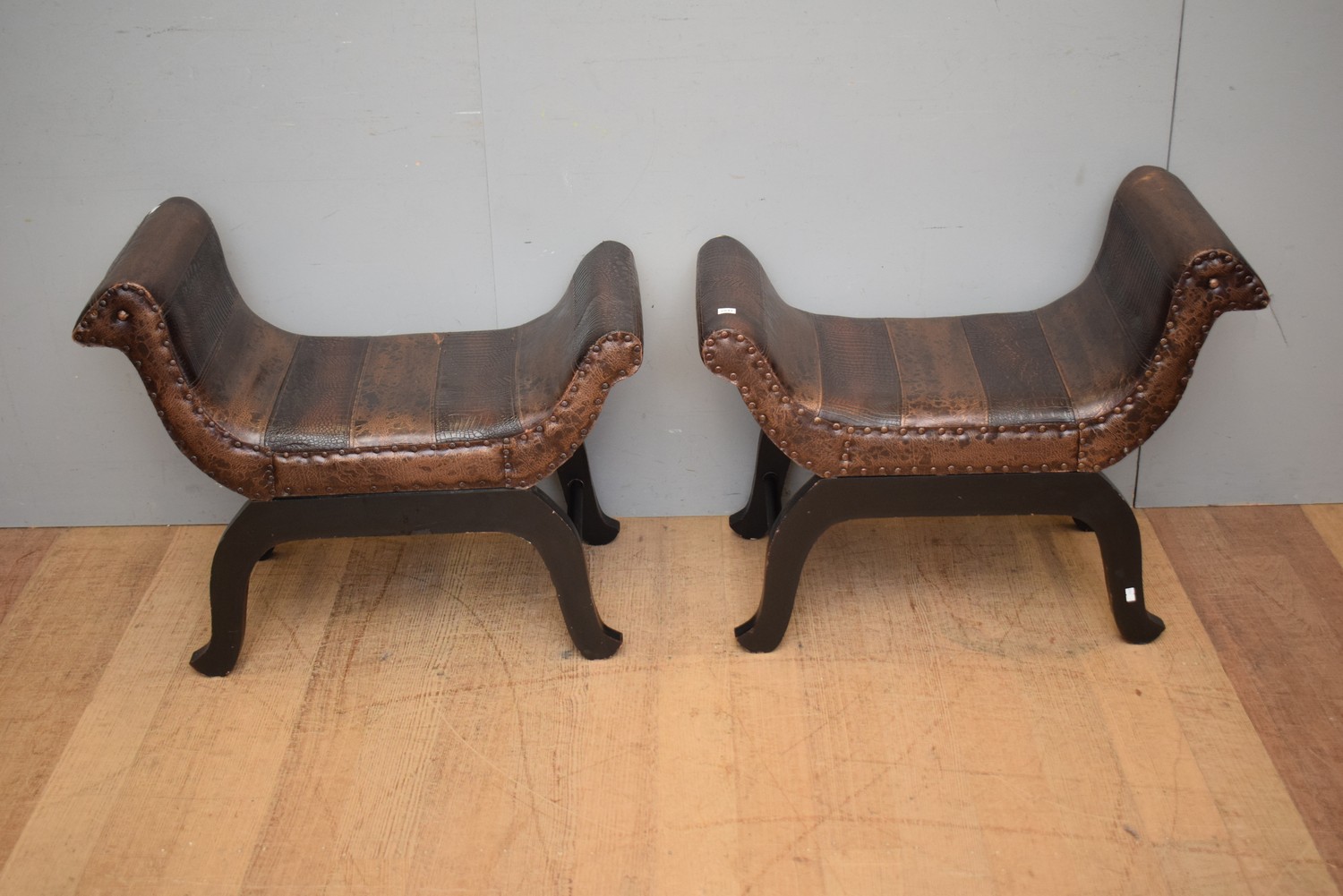 A PAIR OF SCROLLED END LEATHER TOP STOOLS (65H X 80W X 40D CM)