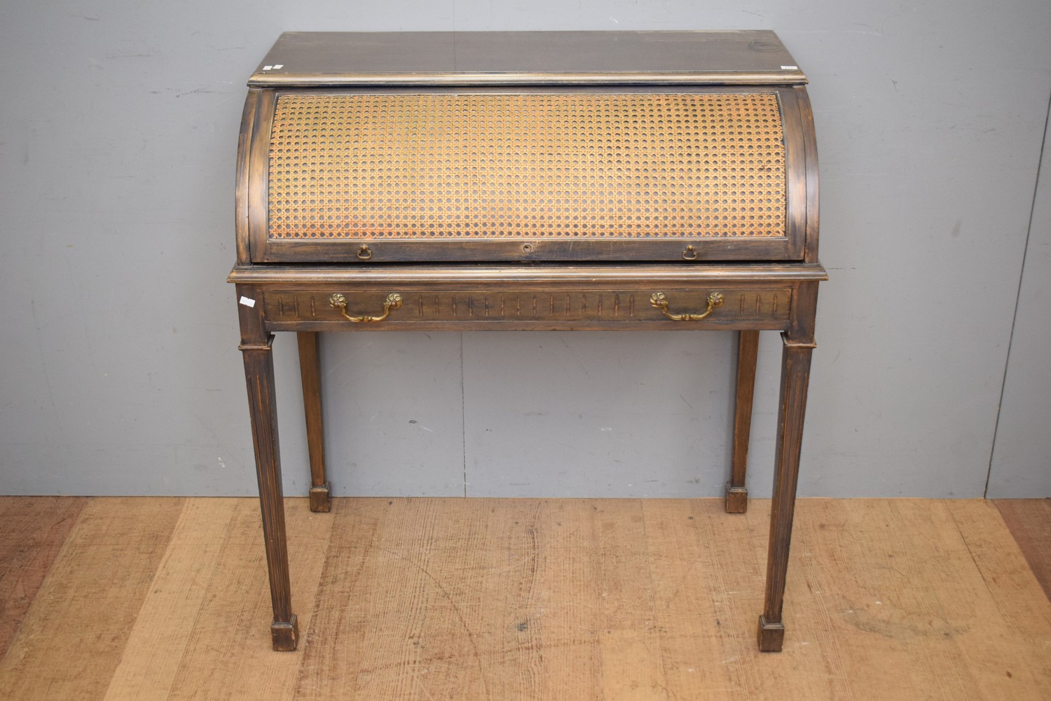 A REGENCY STYLE TAMBOUR DESK WITH WICKER DETAILING (A/F) (100H X 94W X 53D CM)