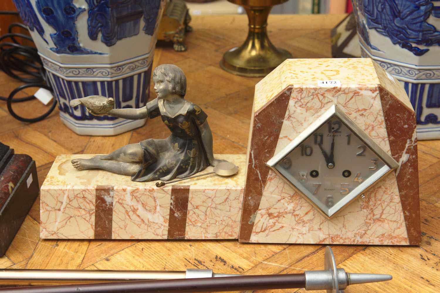 AN ART DECO MARBLE MANTLE CLOCK GIRL WITH BIRD (WITH PENDULUM)