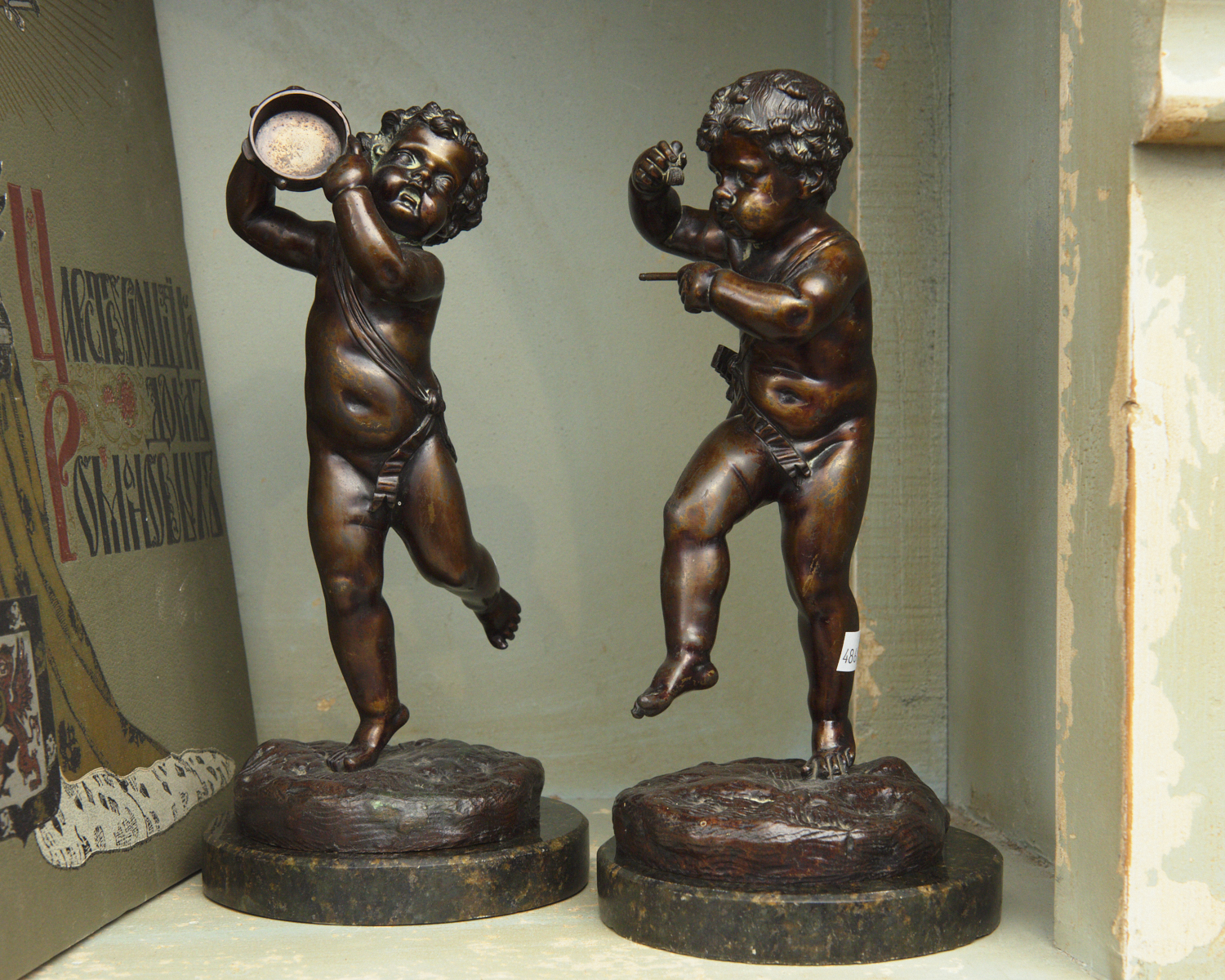 TWO BRONZE CHERUB FIGURES ON MARBLE BASES