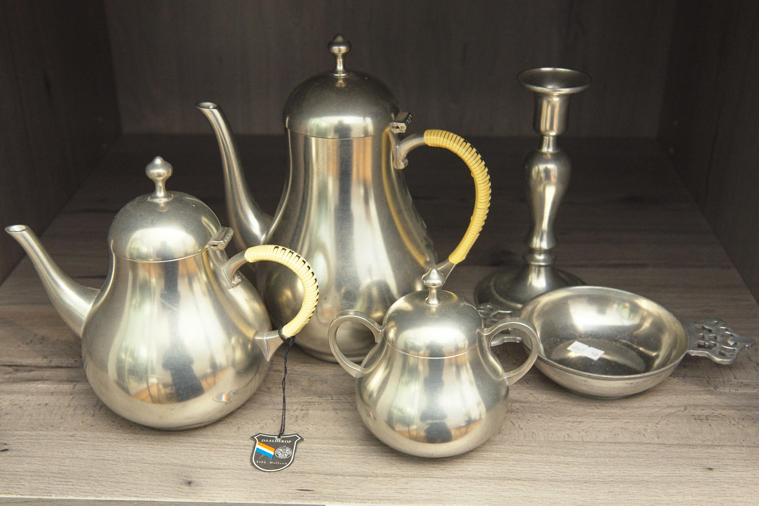 A DUTCH PEWTER TEA AND COFFEE SERVICE TOGETHER WITH BOWL AND CANDLESTICK