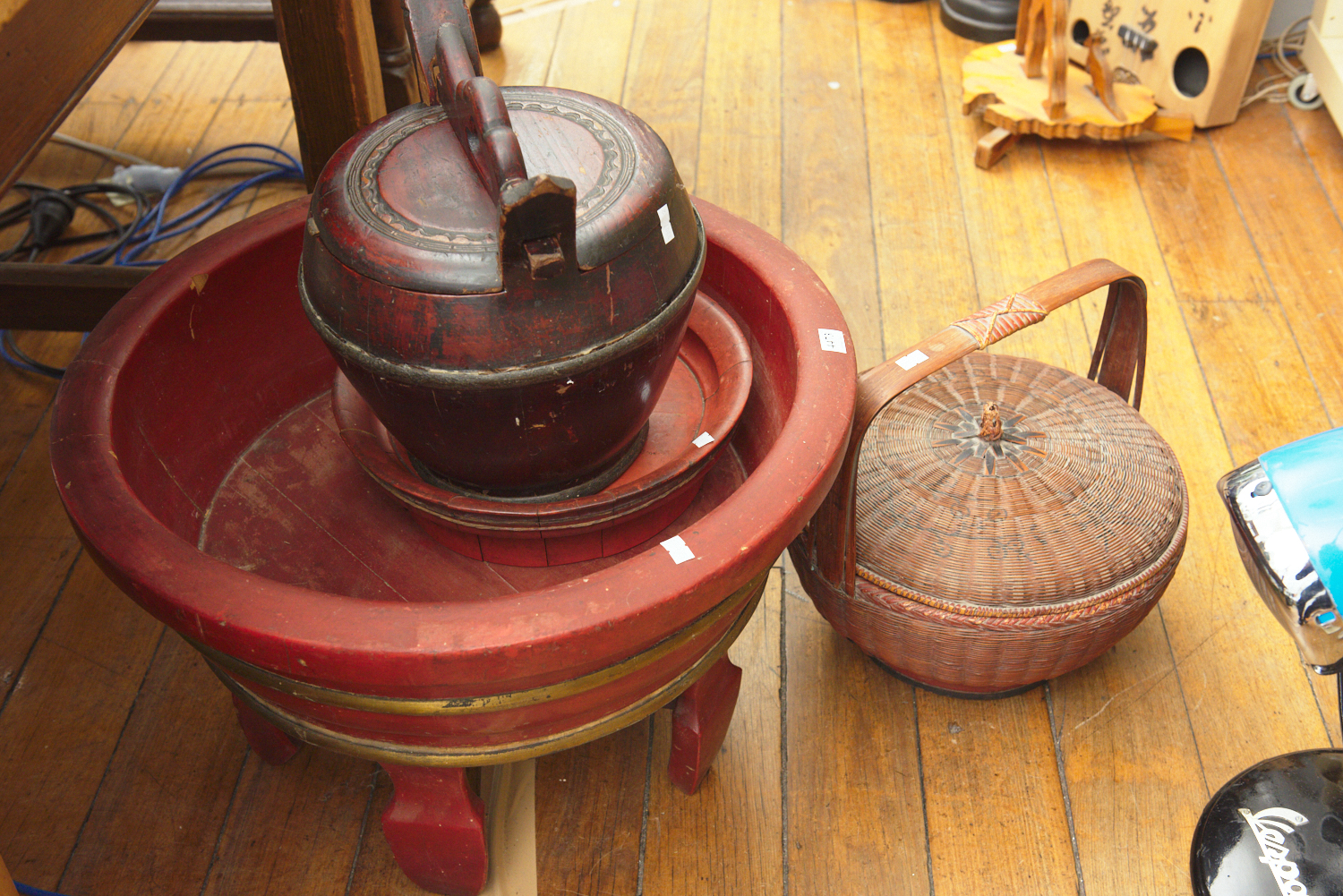 A GROUP OF DOMESTIC WARES INCLUDING A LARGE RED LACQUERED WASH BOWL ON FOUR SUPPORTS, A RED LACQUERED PLATE, A WATER CARRIER AND A KNITTING BASKET