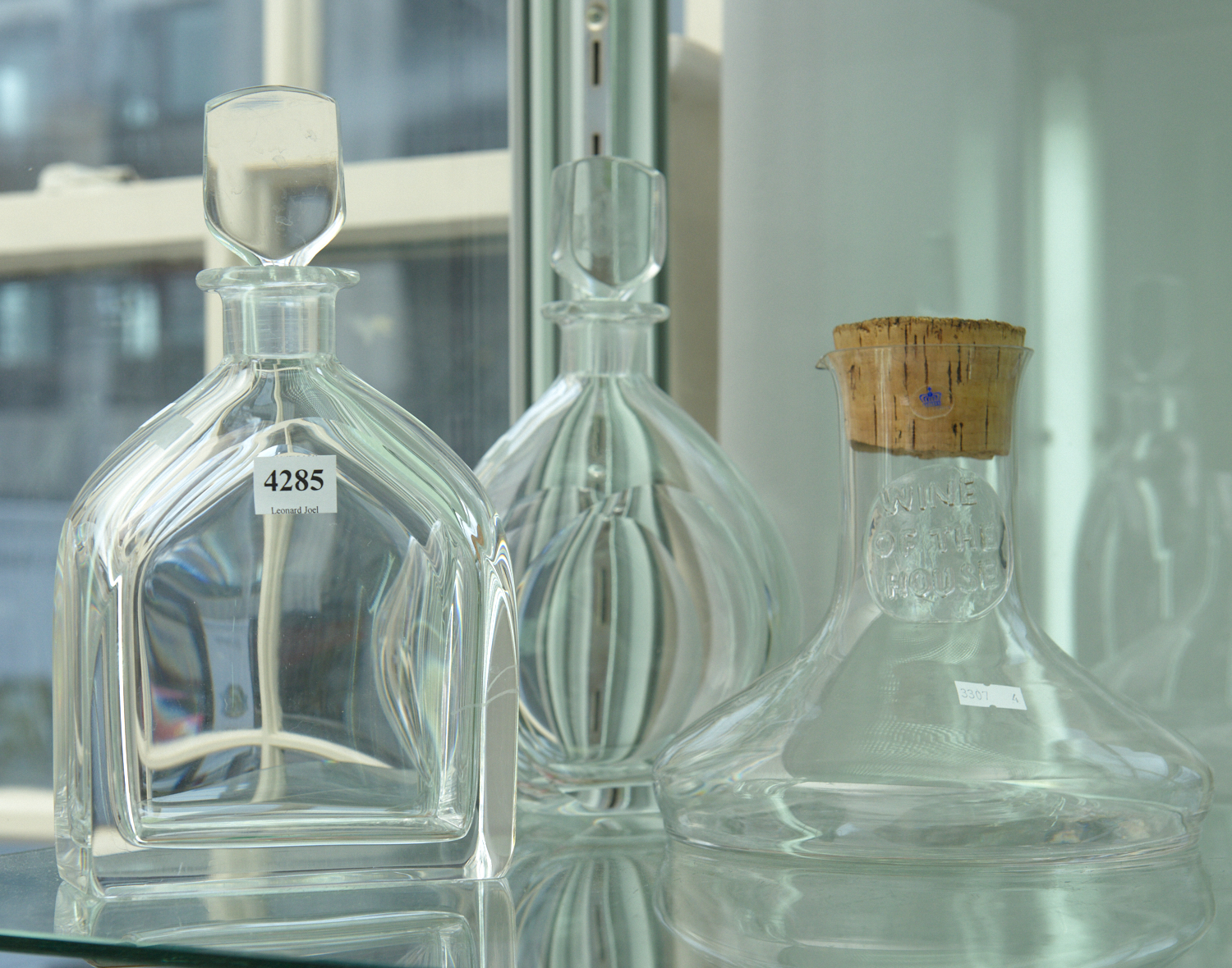 TWO ORREFORS DECANTERS AND ONE GLASS CARAFE WITH A CORK STOPPER