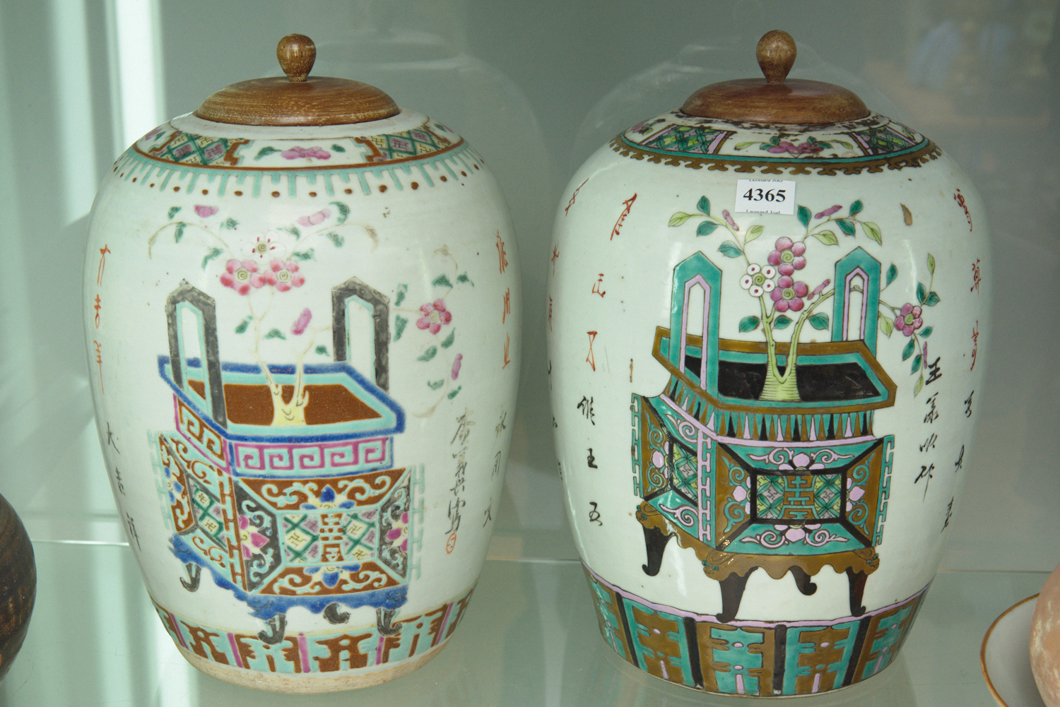 BOTH RING SOUND; OVERALL SURFACE ACCRETIONS TO THE INTERIOR AND EXTERIOR OF BOTH JARS; DARKENED GLAZE HAIRLINE TO THE TOP OF ONE JAR, EXTENDING APPROXIMATELY TWO CENTIMETRES FROM THE RIM; LIGHT WEAR/FADING TO THE PAINTED DECORATION OF ONE JAR