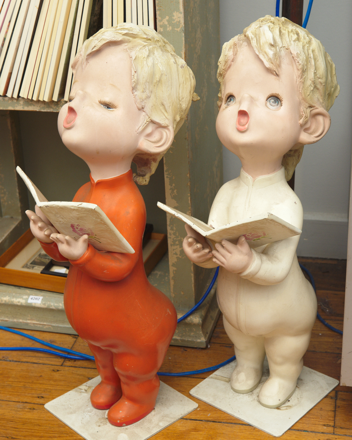 A PAIR OF FIBREGLASS CHOIR BOYS ON STANDS
