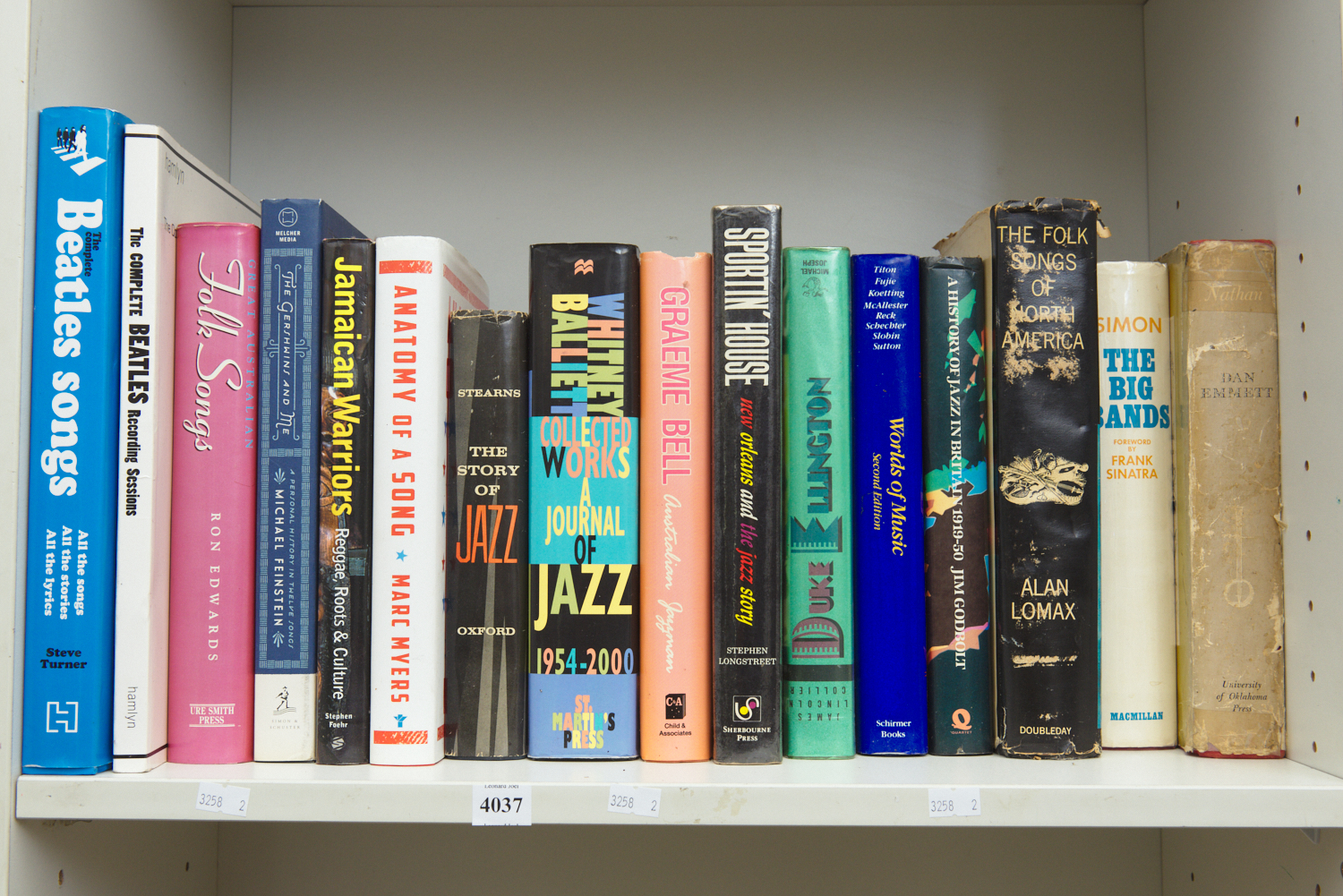 A SHELF OF 20TH CENTURY POPULAR MUSIC REFERENCE, INCLUDING THE FOLK SONGS OF NORTH AMERICA, ALAN LOMAX AND THE COMPLETE BEATLES SONGS