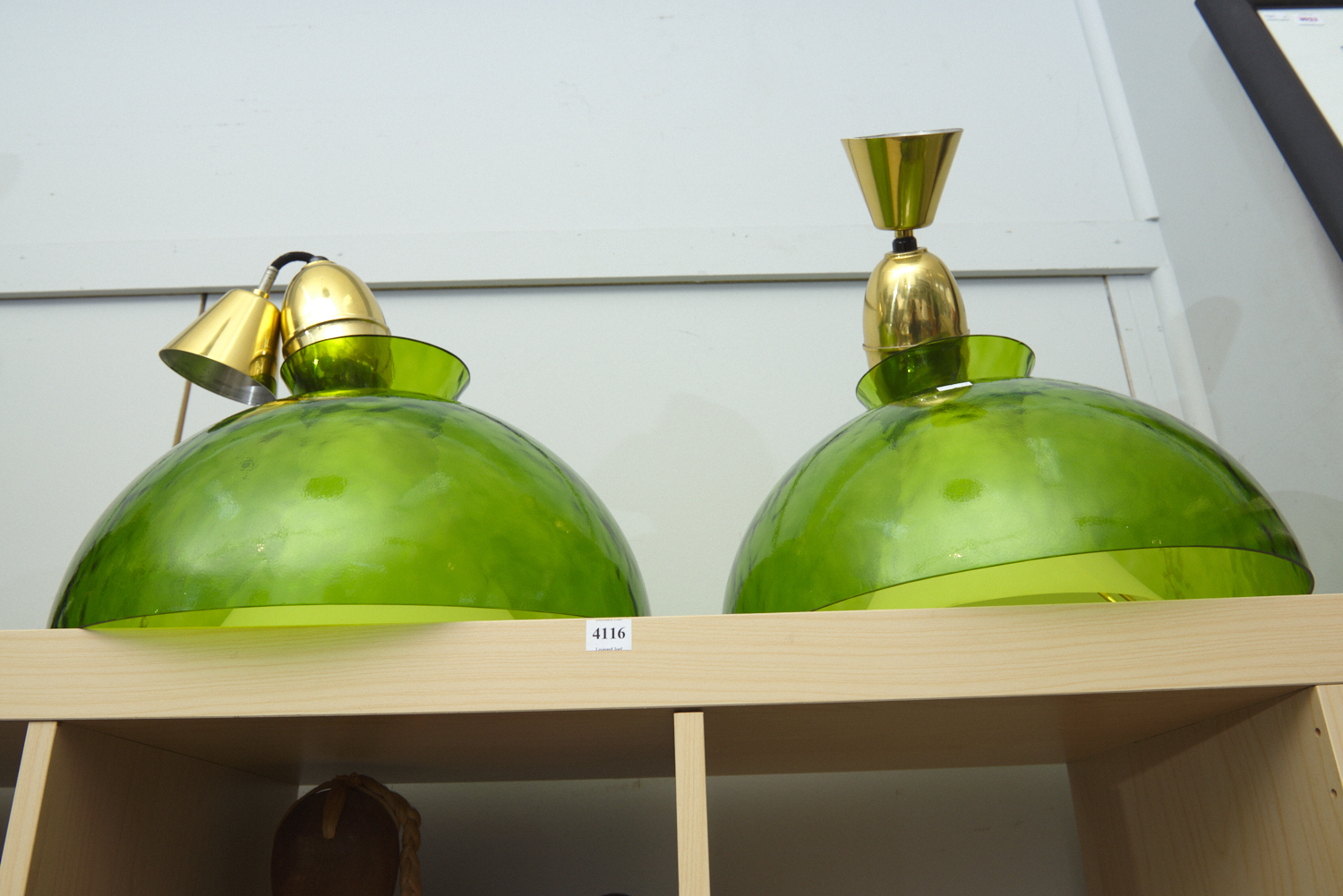 A PAIR OF GREEN MID-CENTURY ADJUSTABLE HANGING LIGHTS