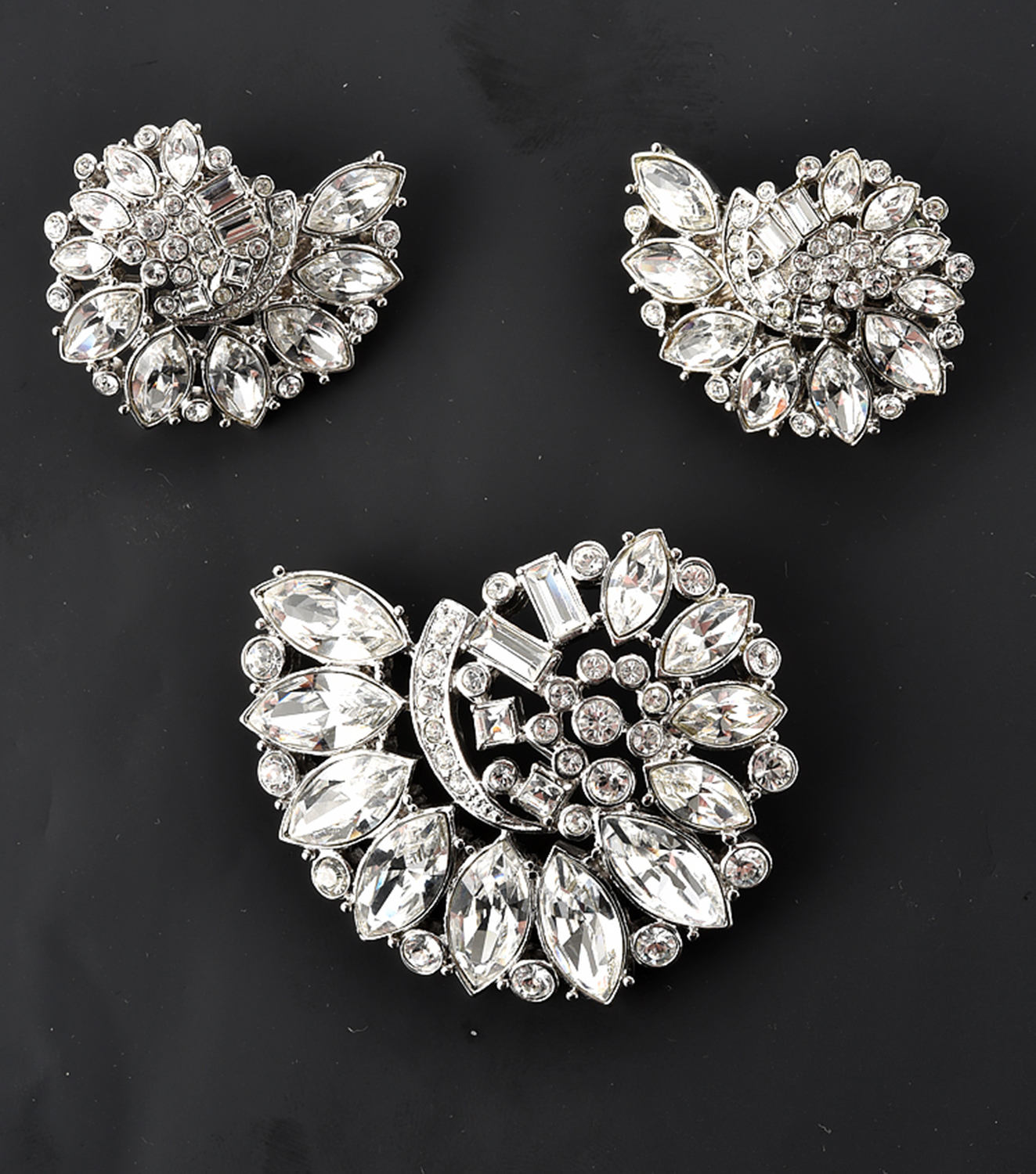 A RETRO STYLE PASTE SET JEWELLERY SUITE, COMPRISING A BROOCH AND A PAIR OF CLIP EARRINGS