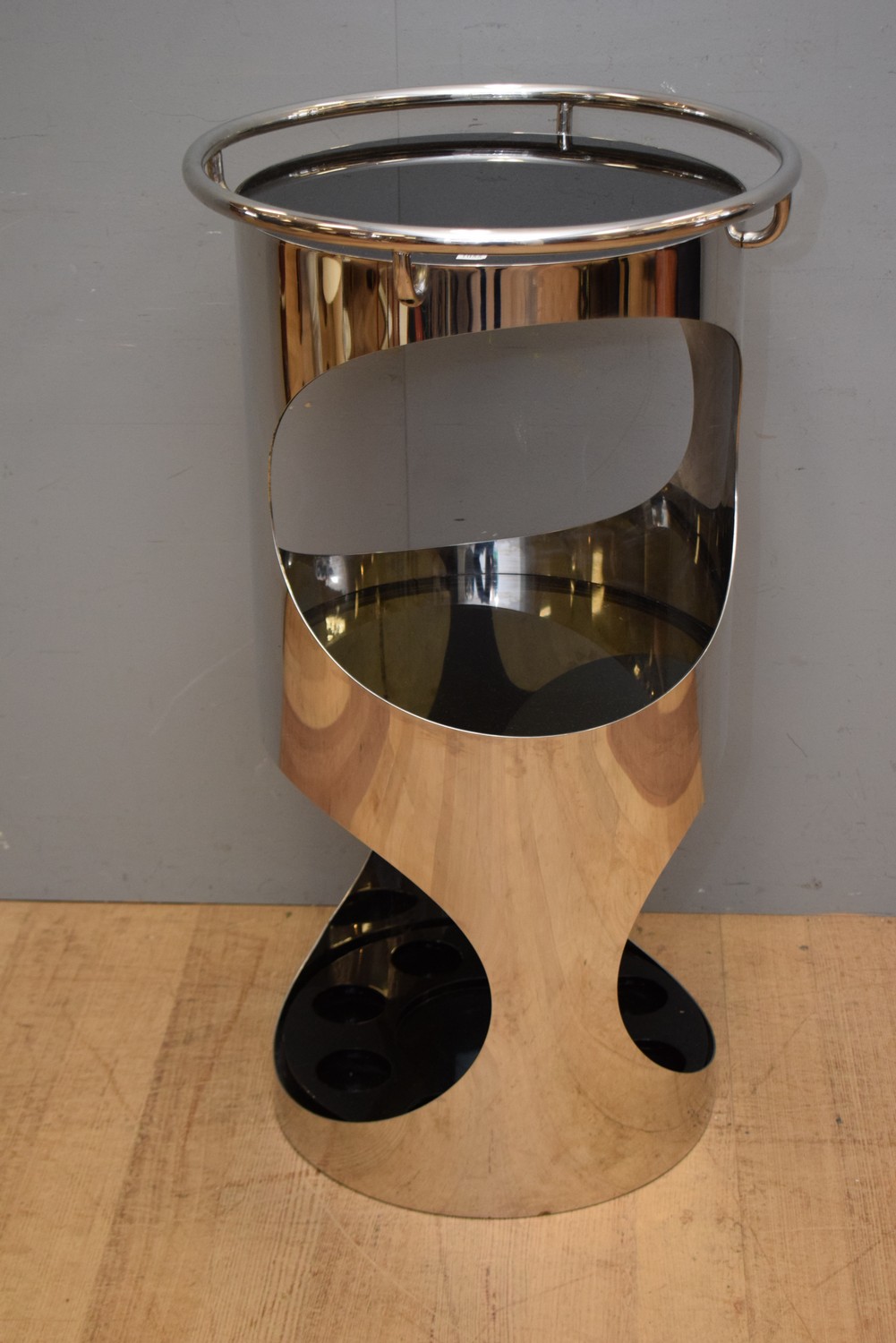 AN ART DECO STYLE CHROME AND SMOKED GLASS DRINKS TABLE (105H X 59D CM) (PLEASE NOTE THIS HEAVY ITEM MUST BE REMOVED BY CLIENTS OR CARRIERS AT THE CUSTOMERS EXPENSE. LEONARD JOEL STAFF CANNOT ASSIST CARRYING THIS ITEM)
