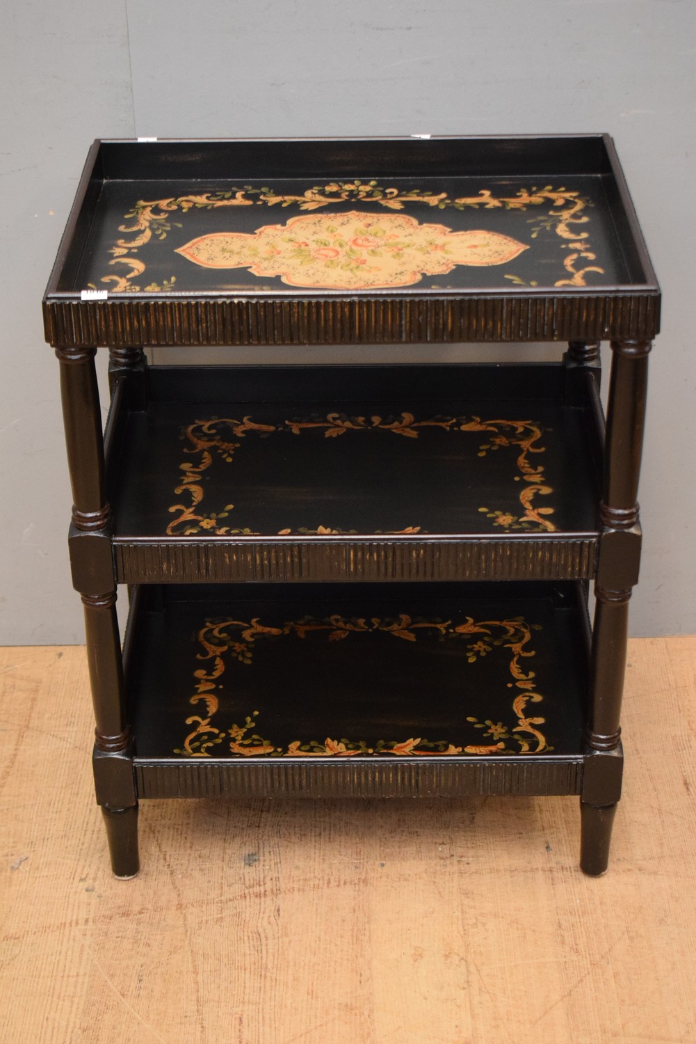 AN EBONISED DECORATIVELY PAINTED THREE TIER SERVING TABLE (78H X 61W X 44D CM)