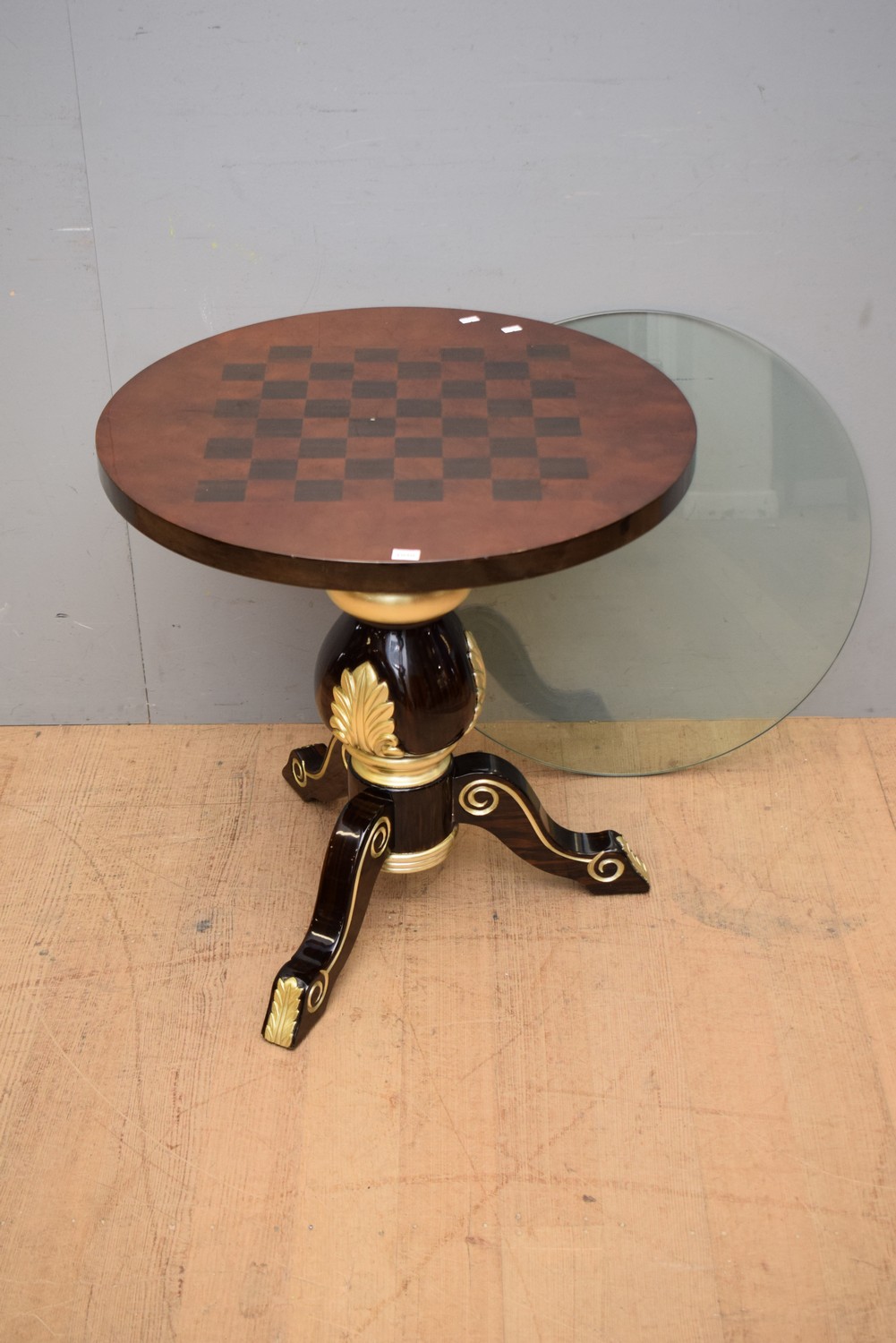 A DECORATIVE CHESS TOP OCCASIONAL TABLE WITH GILT DETAILING (INCLUDES GLASS TOP) (66H X 65D CM)
