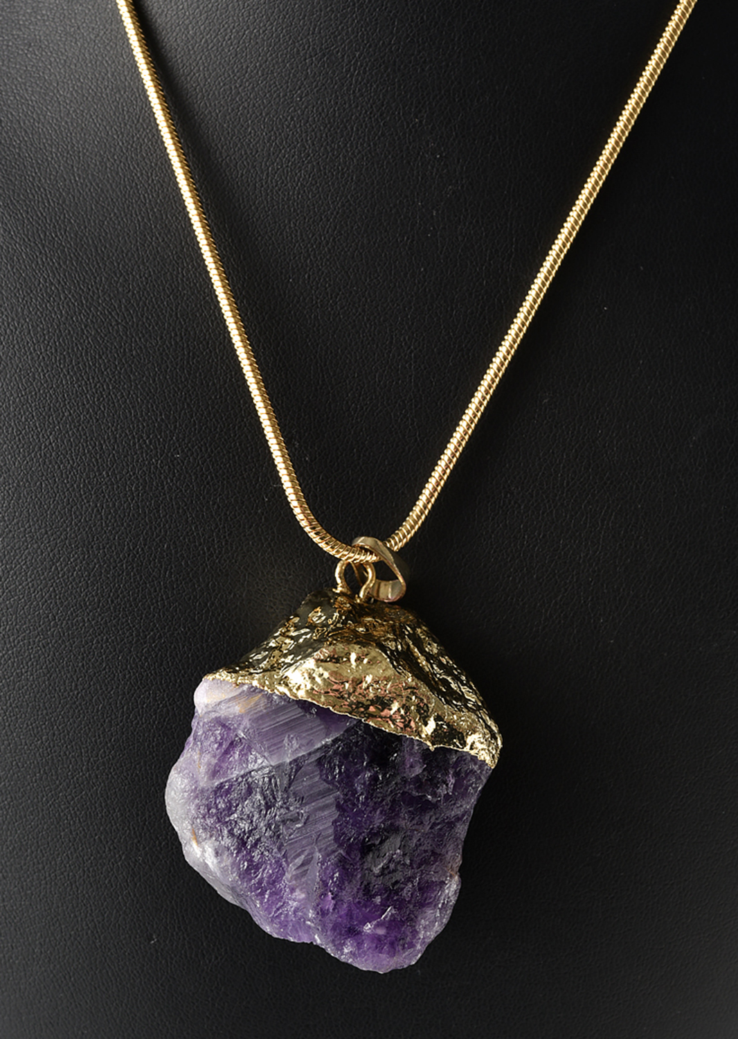 A LARGE ROUGH AMETHYST CRYSTAL SET AS A PENDANT, TO A GOLDEN SNAKE CHAIN