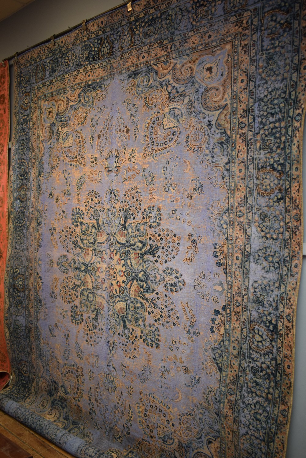 A MAGNIFICENT MODERN OVER-DYED VINTAGE PERSIAN KERMAN CARPET. EX-GALLERY EXHIBITED. CREATED FROM A FINELY HAND-KNOTTED VINTAGE MEDALLION DESIGN PERSIAN KERMAN CARPET, KNOTTED USING HAND SPUN WOOL ON STRONG COTTON WARPS WITH THE PILE SHORN DOWN. THE RUG IS OVER-DYED IN MAUVE, BLUE & RUST-TONED DYES. AS SEEN IN VOGUE & HOME DÉCOR MAGAZINES. CERTIFICATE OF AUTHENTICITY INCLUDED. SIZE: 369X281CM, ORIGIN: PERSIA – RRP: $8,900