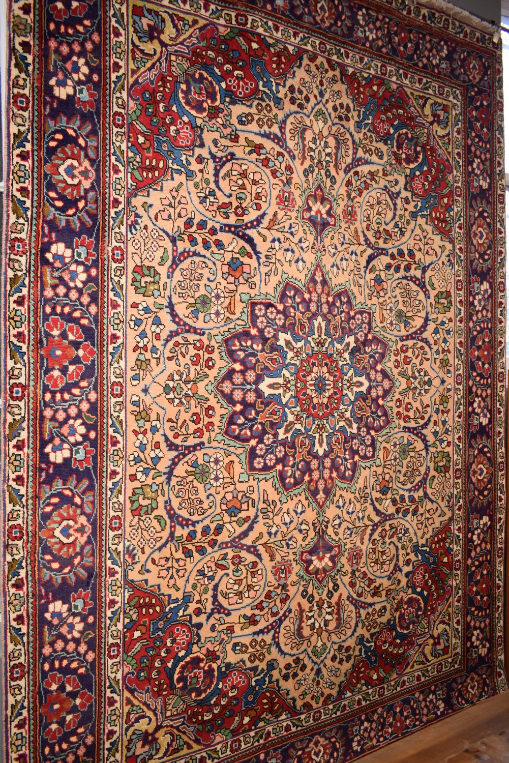 A PERSIAN TABRIZ CARPET. 100% WOOL. DENSE PILE. SOLID & HARD-WEARING. EX-GALLERY INVENTORY. IN EXCELLENT CONDITION. HAND-KNOTTED & WITH TRADITIONAL TABRIZ DESIGN OF BOLD FLORAL MEDALLION & QUARTERED CORNER MEDALLIONS SET WITHIN A FIELD OF VARYING FLORAL SPRAYS & TENDRILS. MAJOR BORDER OF FLORAL SPRAYS. CERTIFICATE OF AUTHENTICITY INCLUDED. SIZE: 295X206CM, ORIGIN: TABRIZ/PERSIA – RRP: $2,900