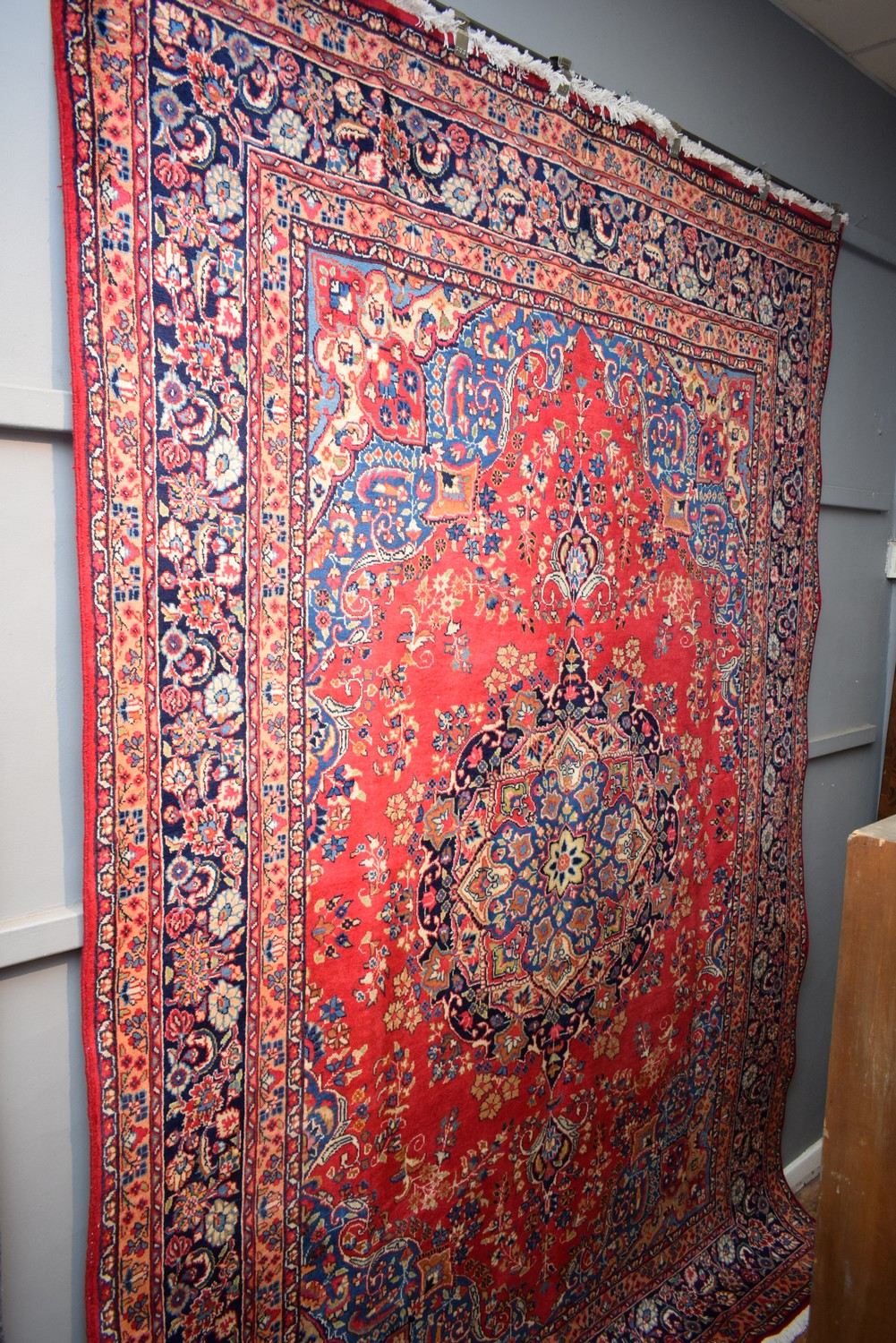 A LARGE PERSIAN SABZEVAR CARPET. 100% WOOL PILE. HAND-KNOTTED & WITH TRADITIONAL PERSIAN DESIGN OF BOLD FLORAL MEDALLION & QUARTERED CORNER MEDALLIONS IN A RED BACKGROUND OF FLORAL SPRAYS. BORDER OF PALMETTES, FLORAL MOTIFS & TENDRILS. EX-GALLERY INVENTORY. CERTIFICATE OF AUTHENTICITY INCLUDED. SIZE: 340X243CM, ORIGIN: PERSIA – RRP: $4,500