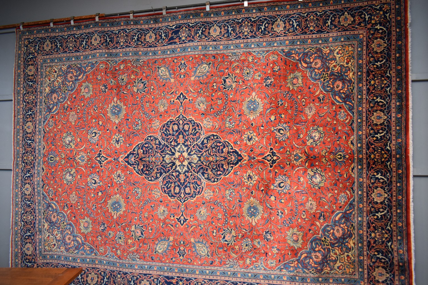 A FINELY HAND-KNOTTED PERSIAN SAROUQ CARPET. 100% FINE WOOL PILE. GALLERY EXHIBITED. IN PRISTINE CONDITION. CLASSIC SAROUQ DESIGN OF STYLIZED MEDALLION & QUARTERED CORNER MEDALLIONS IN A RED FIELD OF PALMETTES, FLORAL SPRAYS & TENDRILS. BORDER OF PALMETTES & TENDRILS. CERTIFICATE OF AUTHENTICITY INCLUDED. SIZE: 402X304CM, ORIGIN: PERSIA – RRP: $9,900