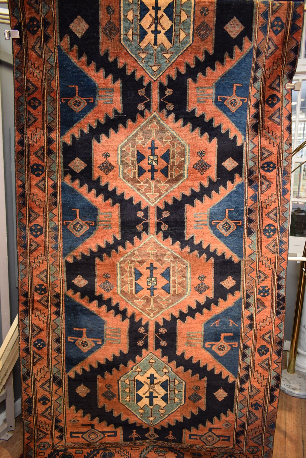 A CIRCA 1960s TRIBAL PERSIAN QULTOQ RUG. 100% WOOL. NATURAL DYES. EX-GALLERY DISPLAYED. IN EXCELLENT CONDITION. FINELY HAND-KNOTTED TRIBAL WEAVE & DESIGN OF HOOKED GEOMETRIC MEDALLIONS & SEMI MEDALLIONS IN A NAVY-BLUE FIELD. BORDER OF LEAF PATTERNS. THE ENTIRE IN VIBRANT TONES OF BLUES, RED & CREAM. CERTIFICATE OF AUTHENTICITY INCLUDED. SIZE: 316X141CM, ORIGIN: PERSIA – RRP: $3,900